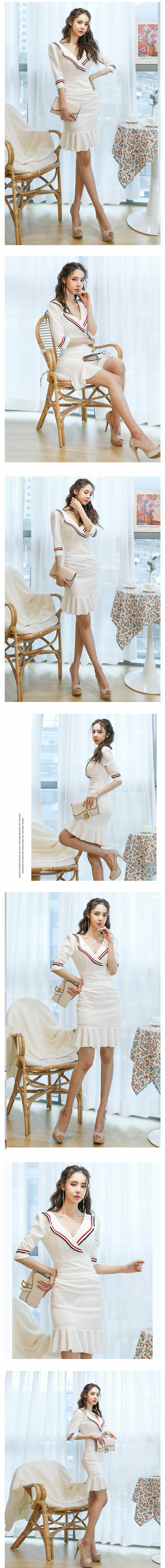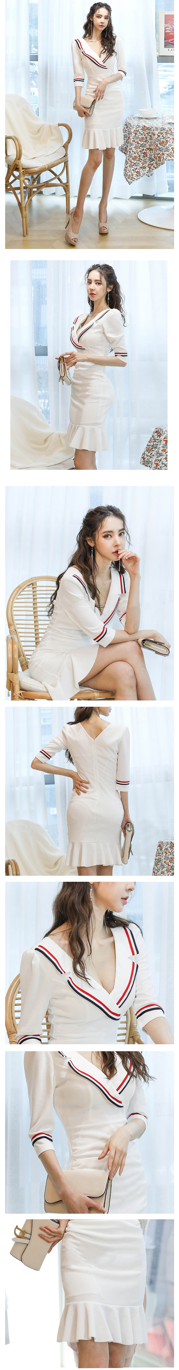 現貨-經典海軍風撞色V領高腰修身包臀荷葉裙擺連身中長裙洋裝-麋鹿森林【SFE4574】