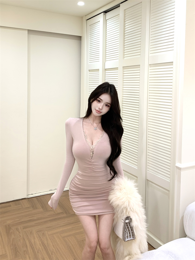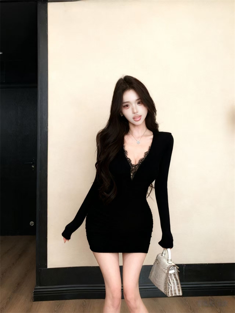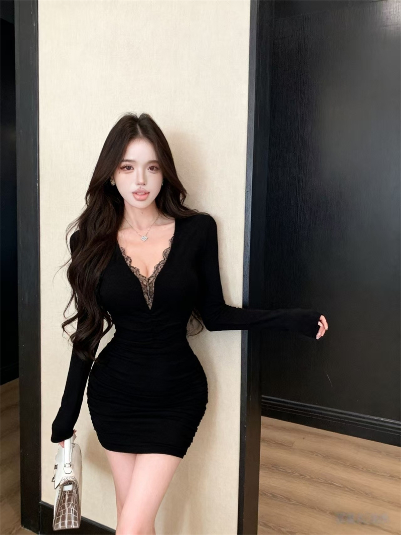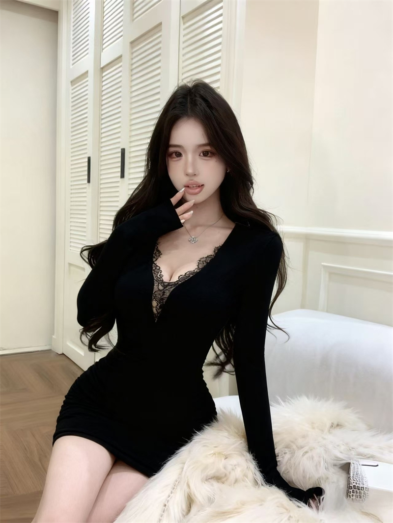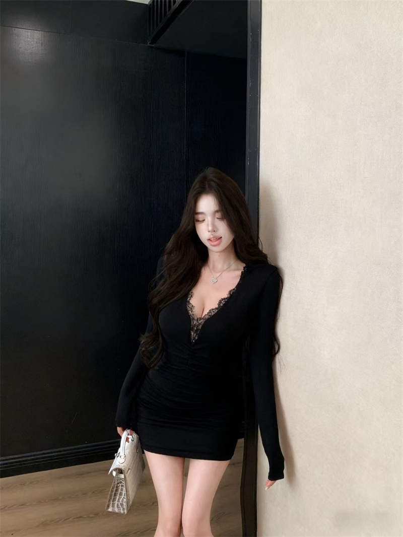 低胸透視蕾絲彈力薄棉包臀短裙洋裝FZ13092