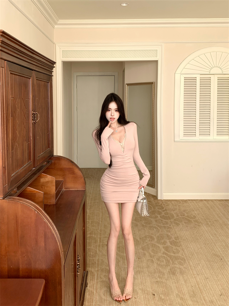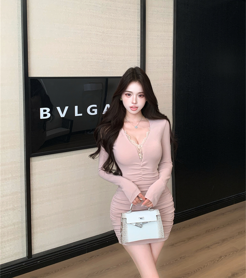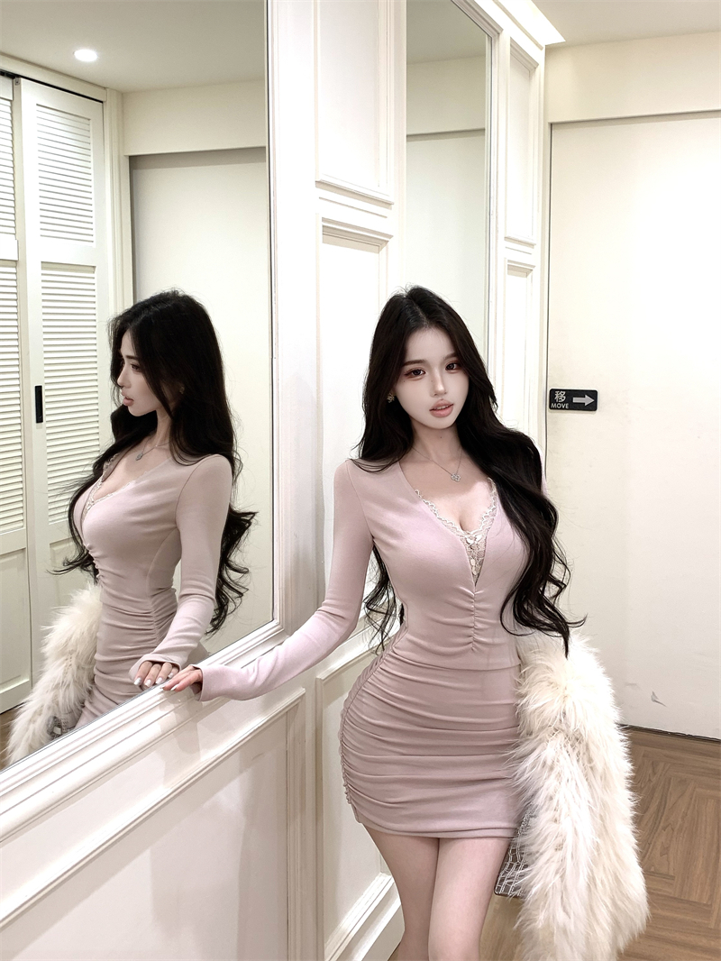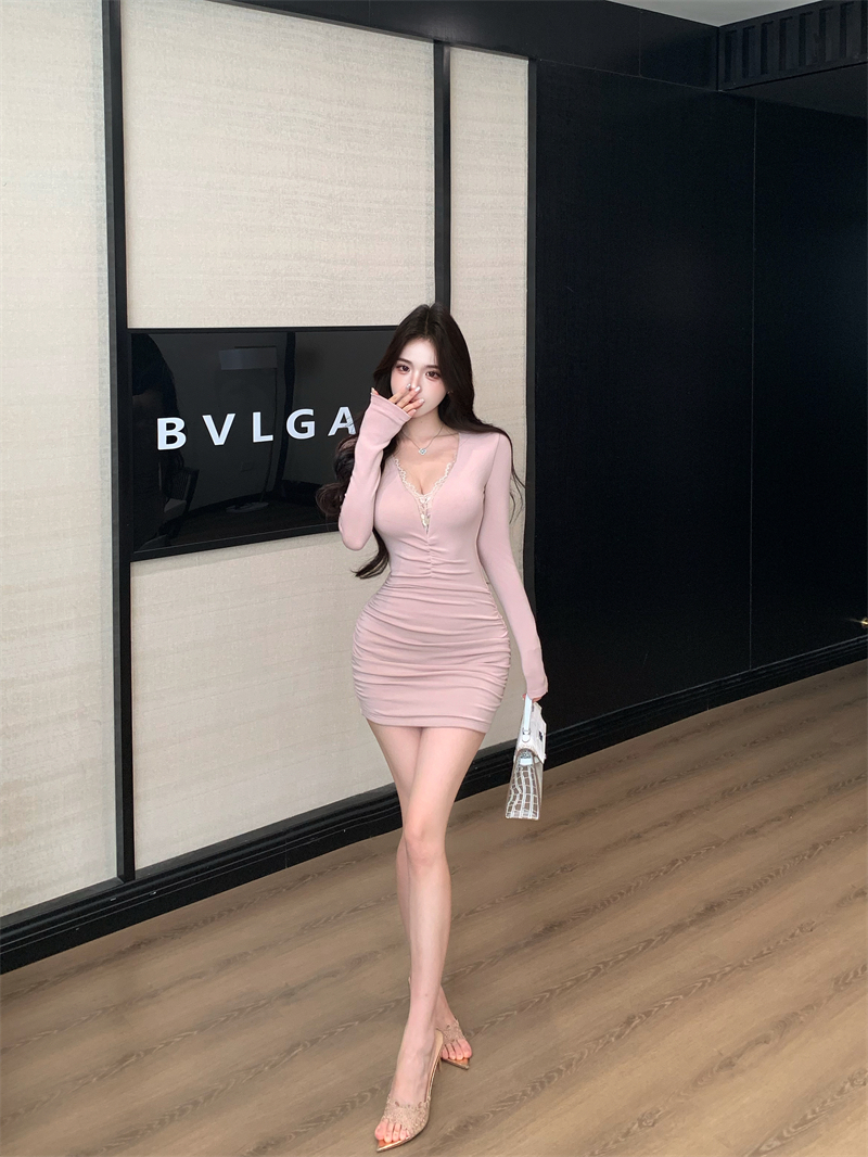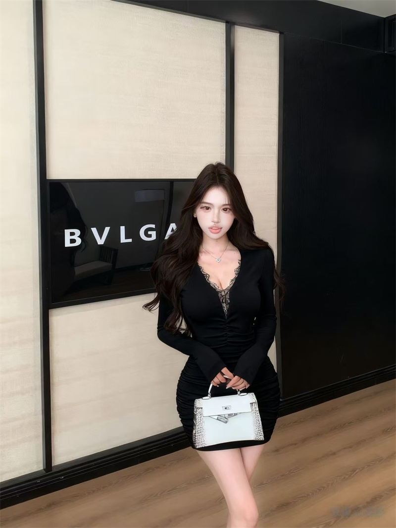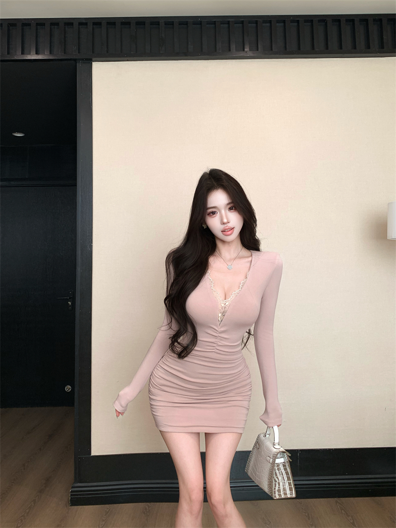 低胸透視蕾絲彈力薄棉包臀短裙洋裝FZ13092