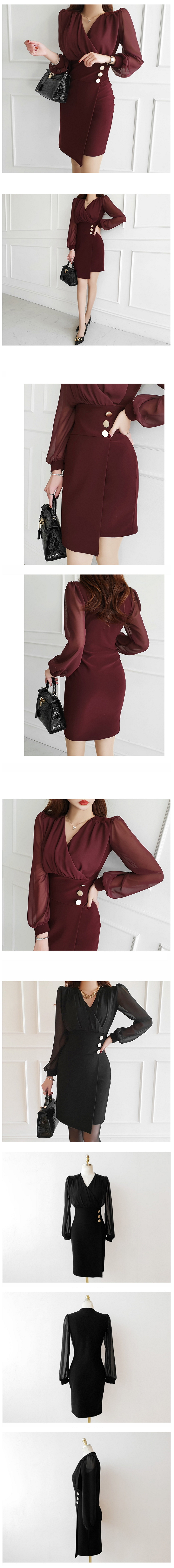 現貨-優雅雪紡袖拼接交叉V領修身不規則職場連身中短裙通勤洋裝-麋鹿森林【SFG7844】