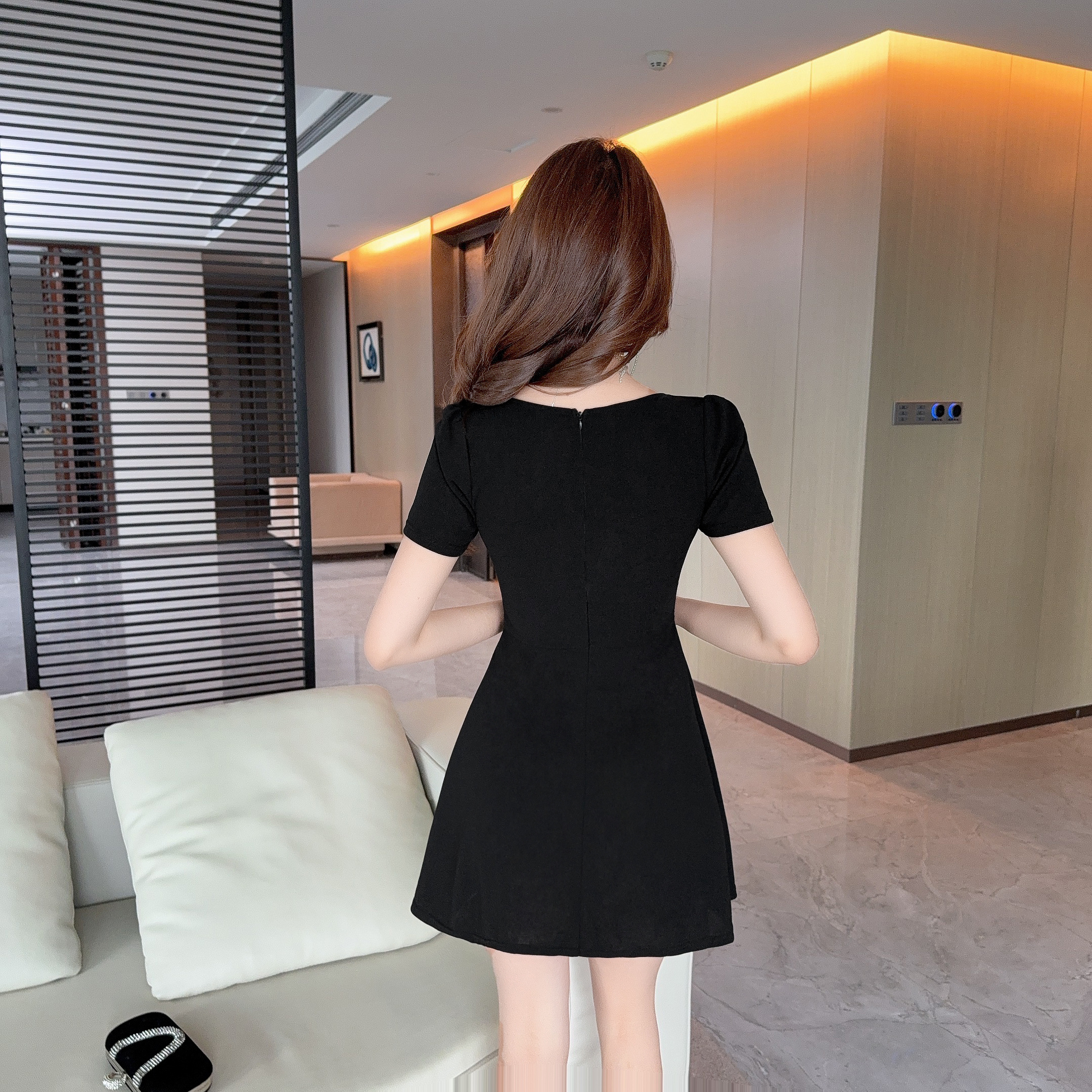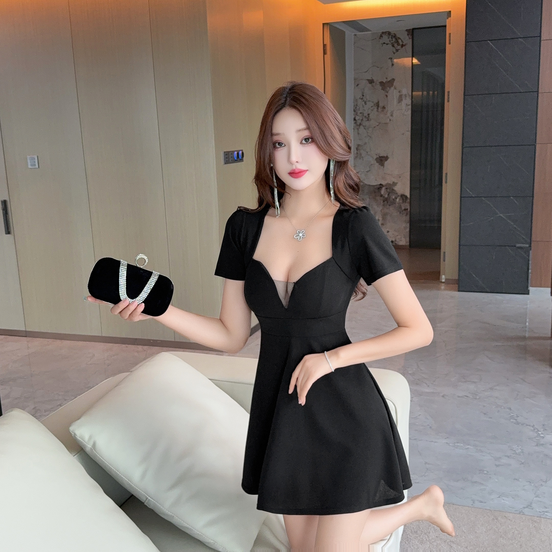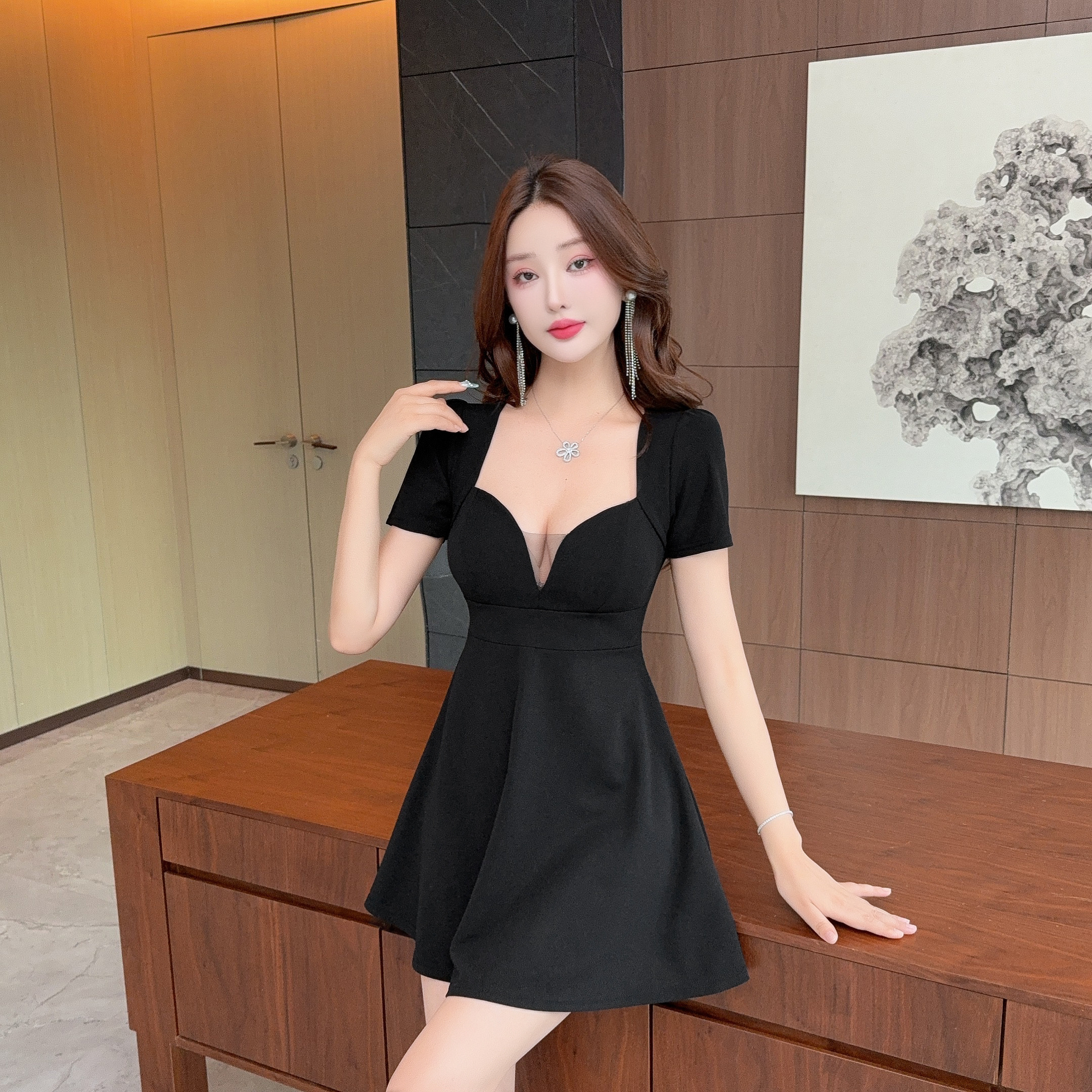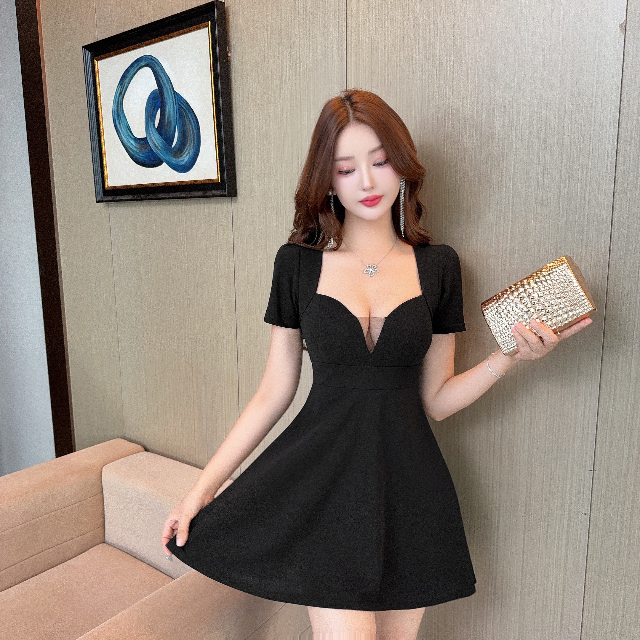 圓弧低胸網紗帶胸墊圓裙洋裝FY12725