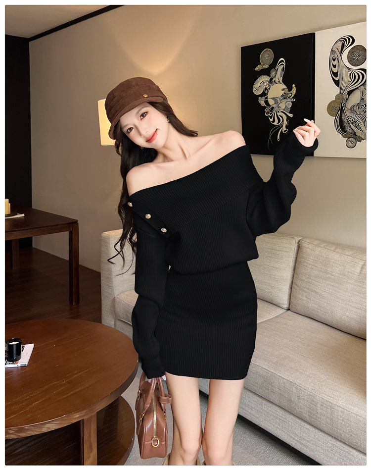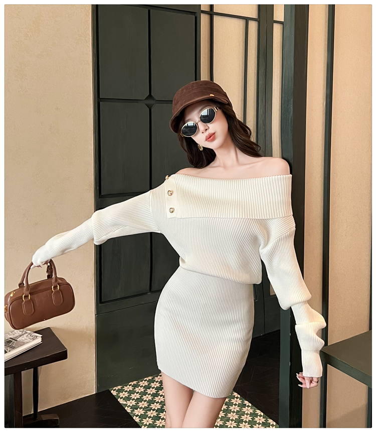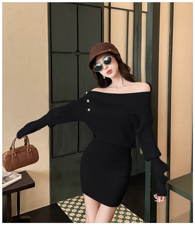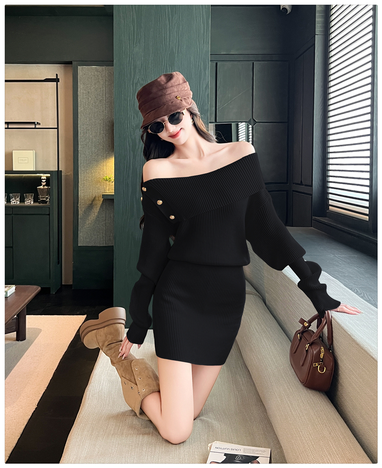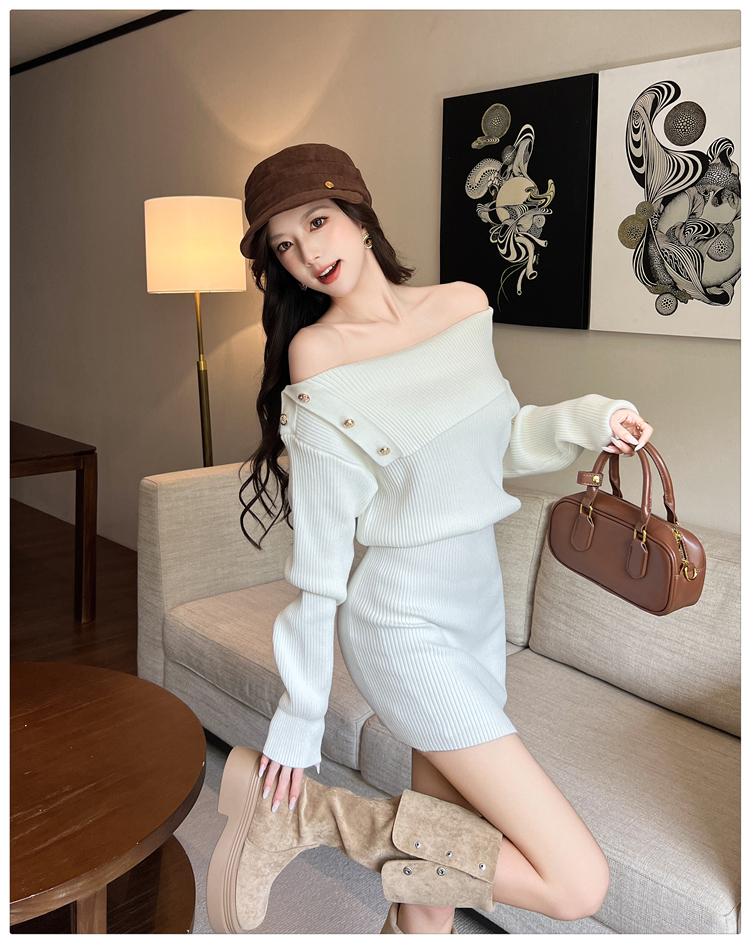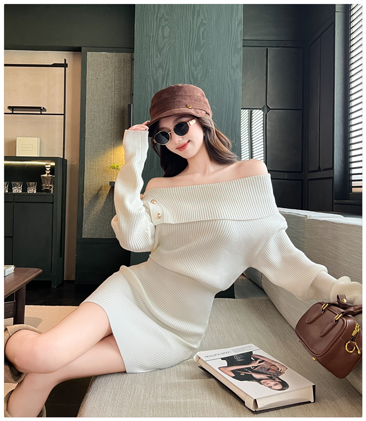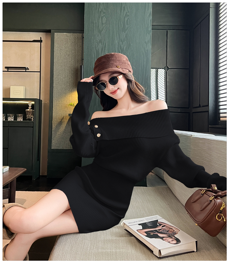大翻領露肩寬袖針織包臀短裙洋裝FZ13075