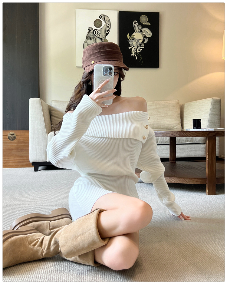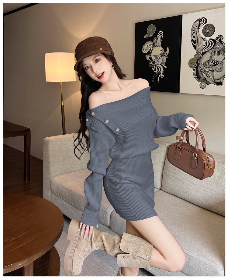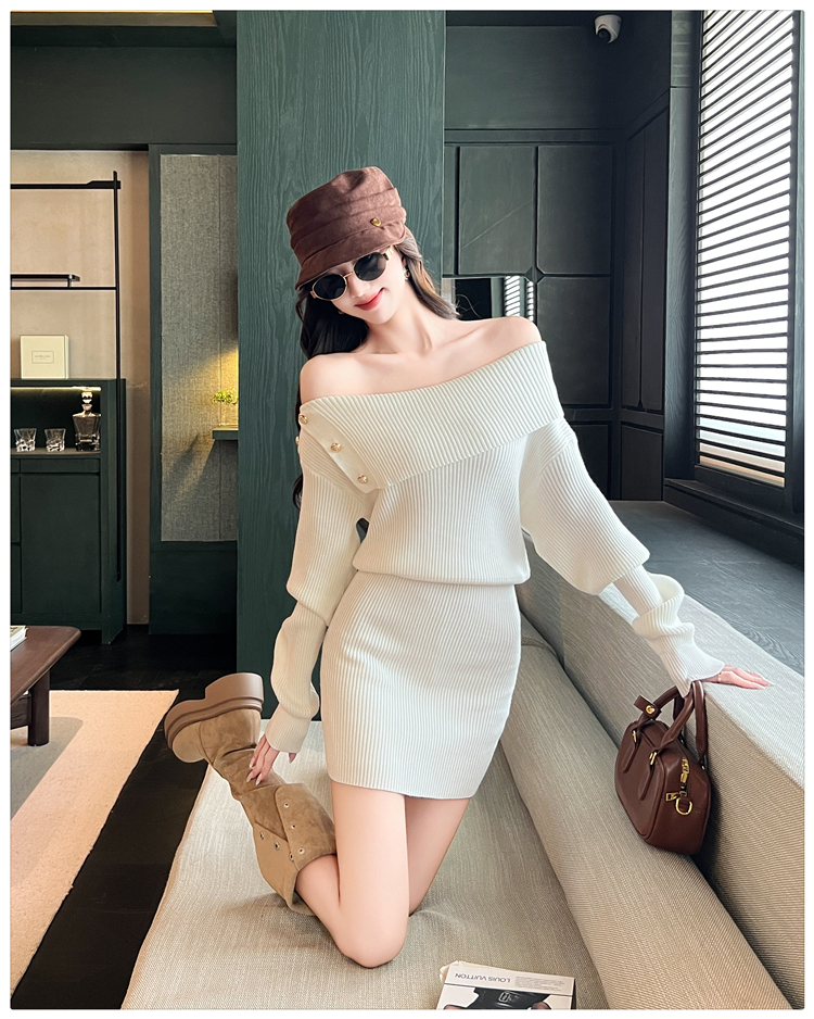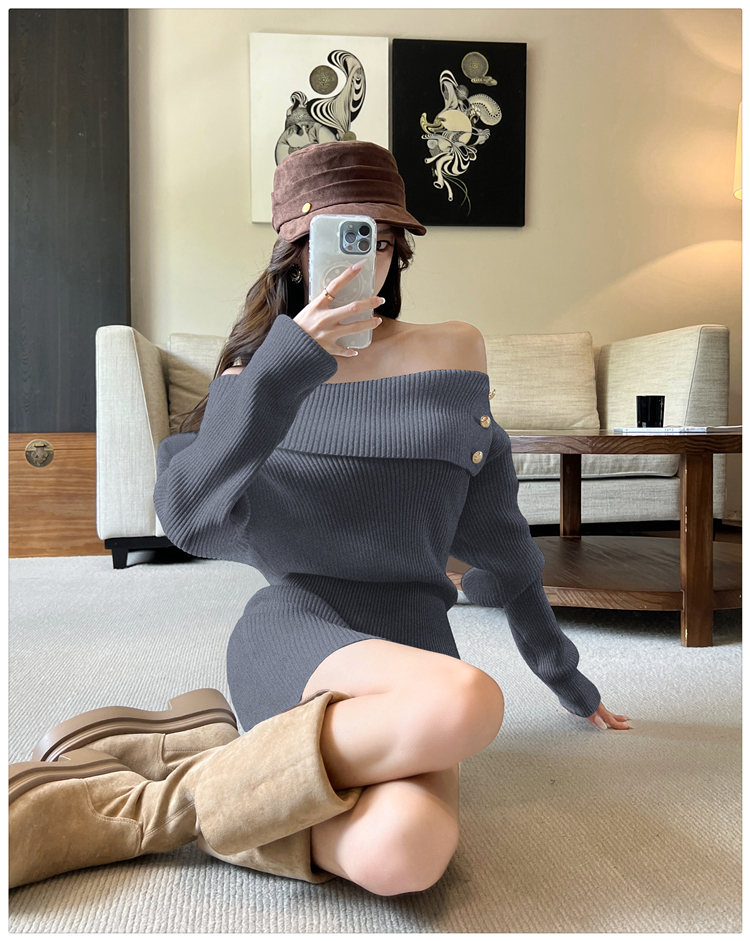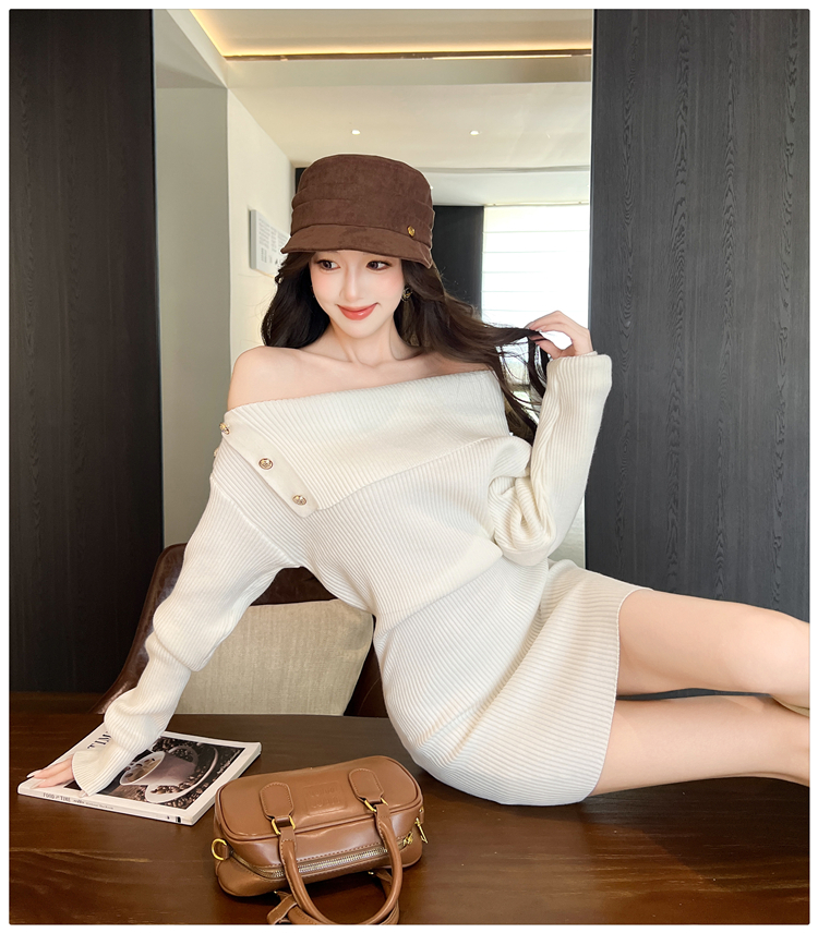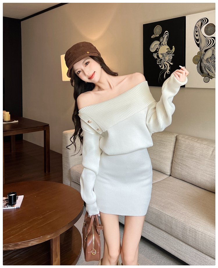 大翻領露肩寬袖針織包臀短裙洋裝FZ13075