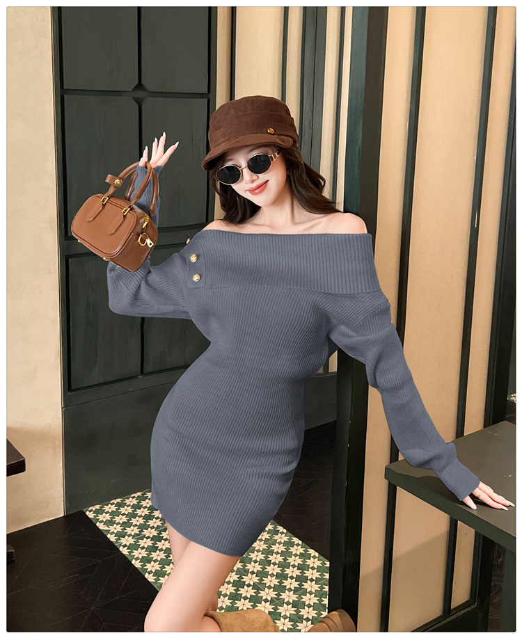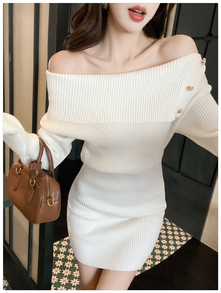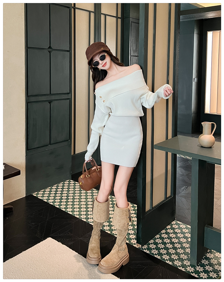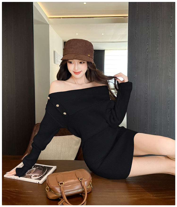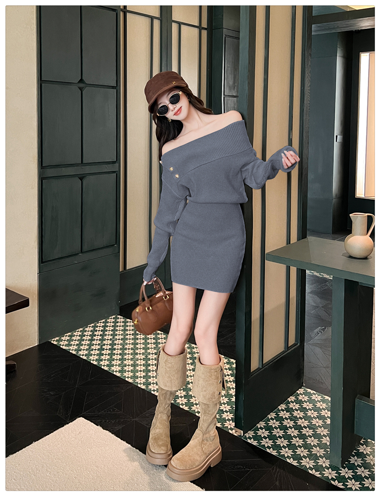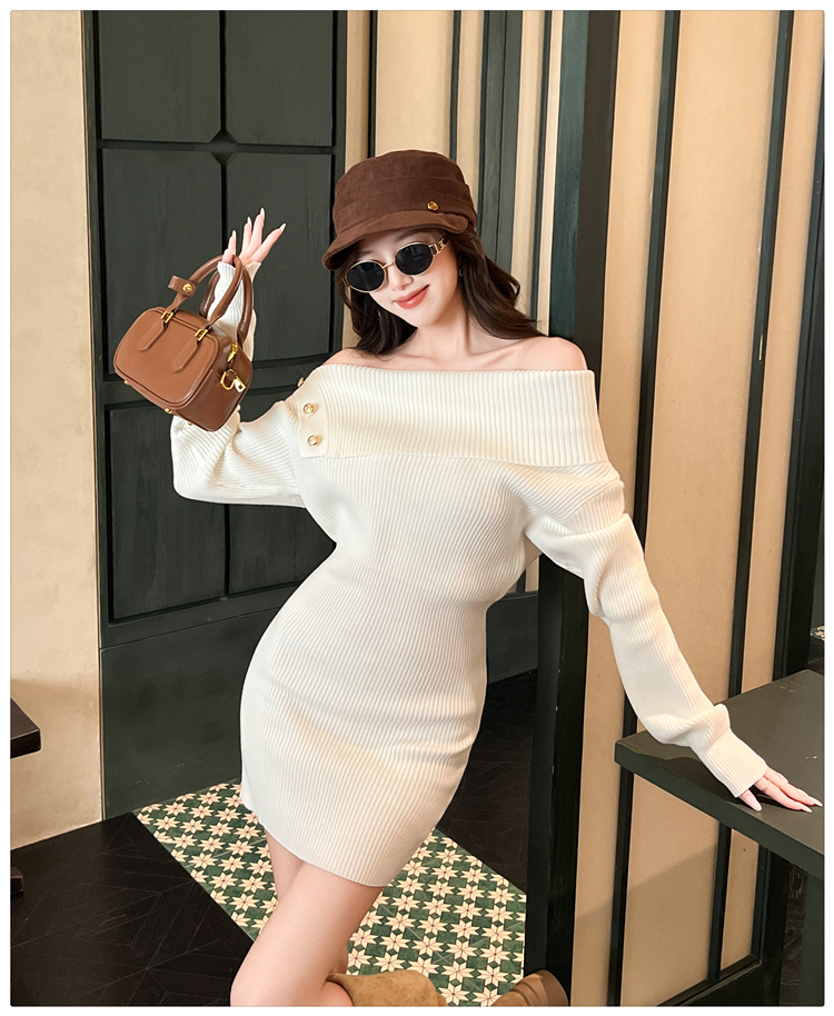 大翻領露肩寬袖針織包臀短裙洋裝FZ13075