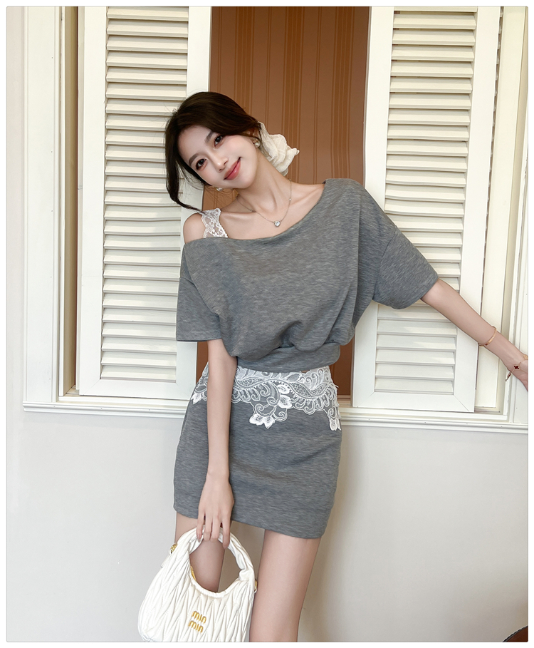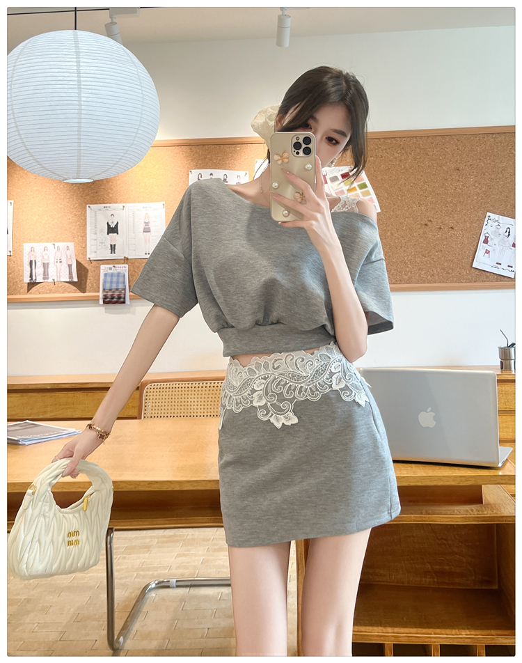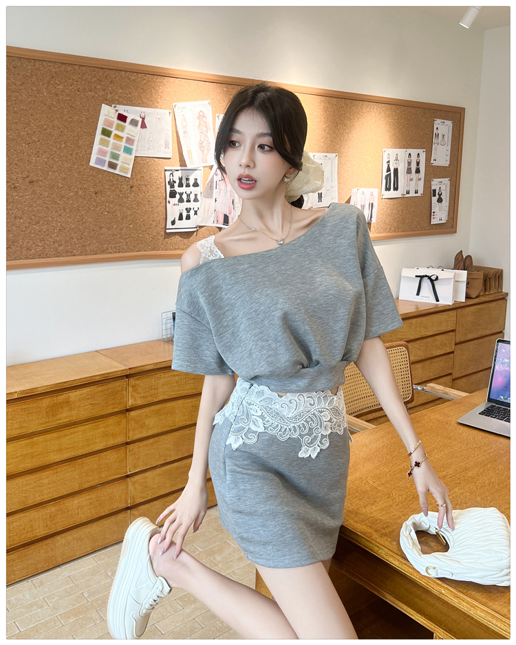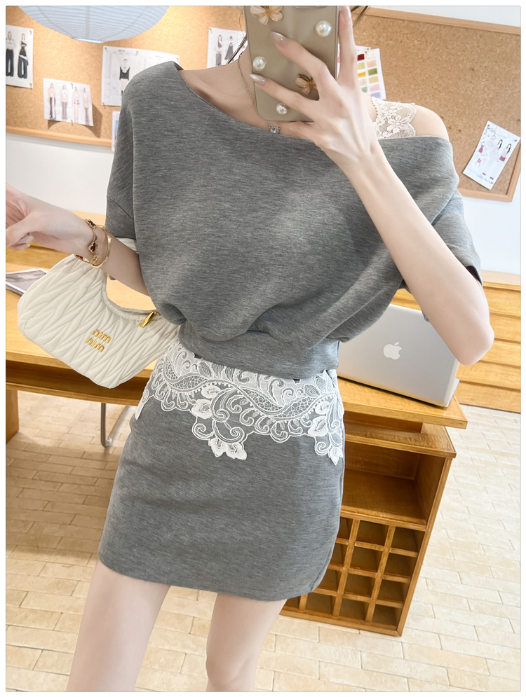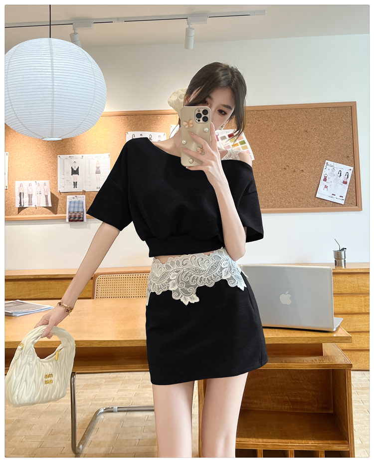 套裝-斜肩蕾絲短上衣+蕾絲腰短裙FZ12414