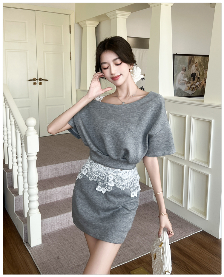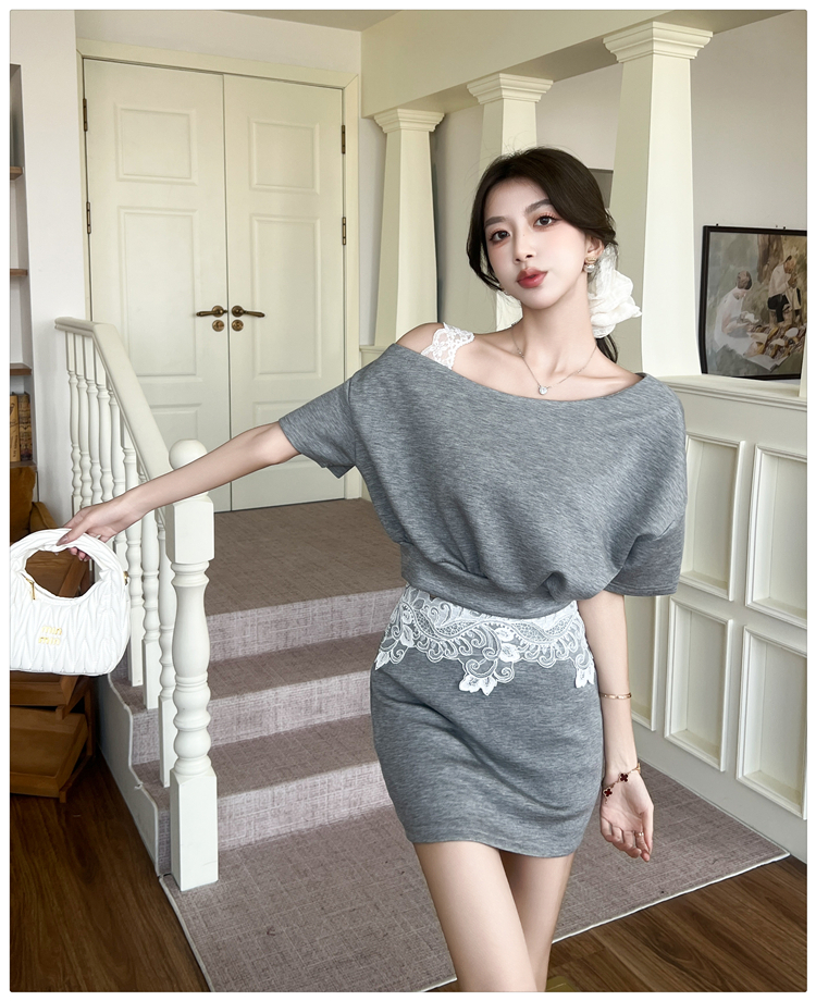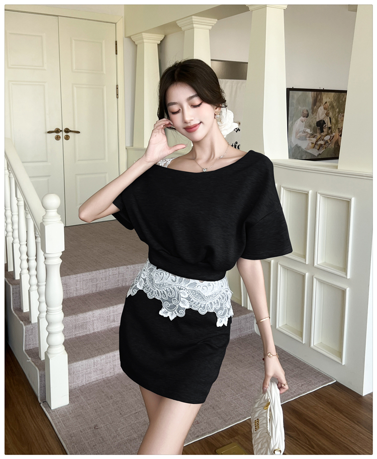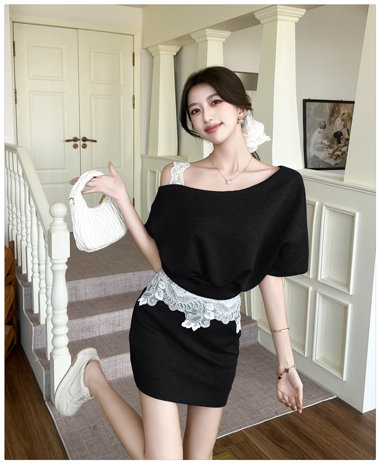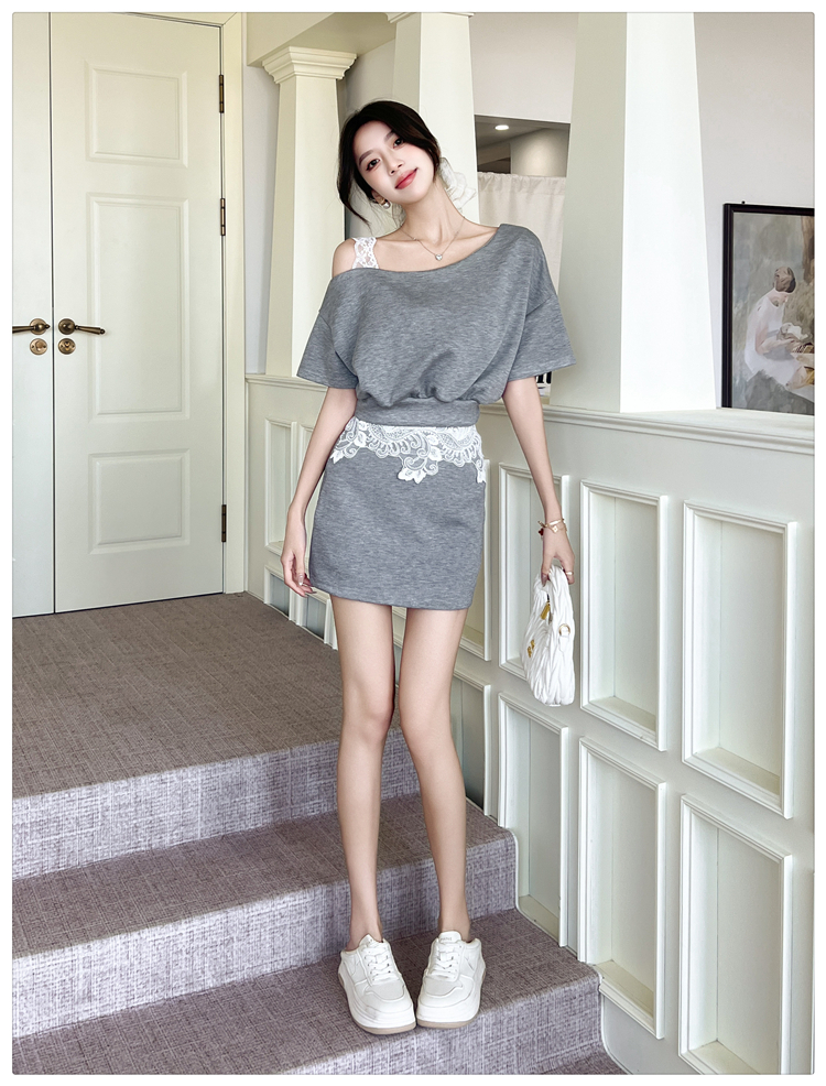 套裝-斜肩蕾絲短上衣+蕾絲腰短裙FZ12414