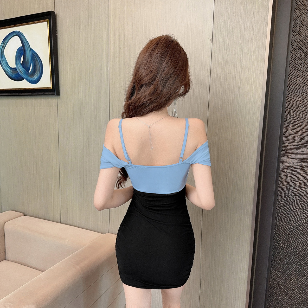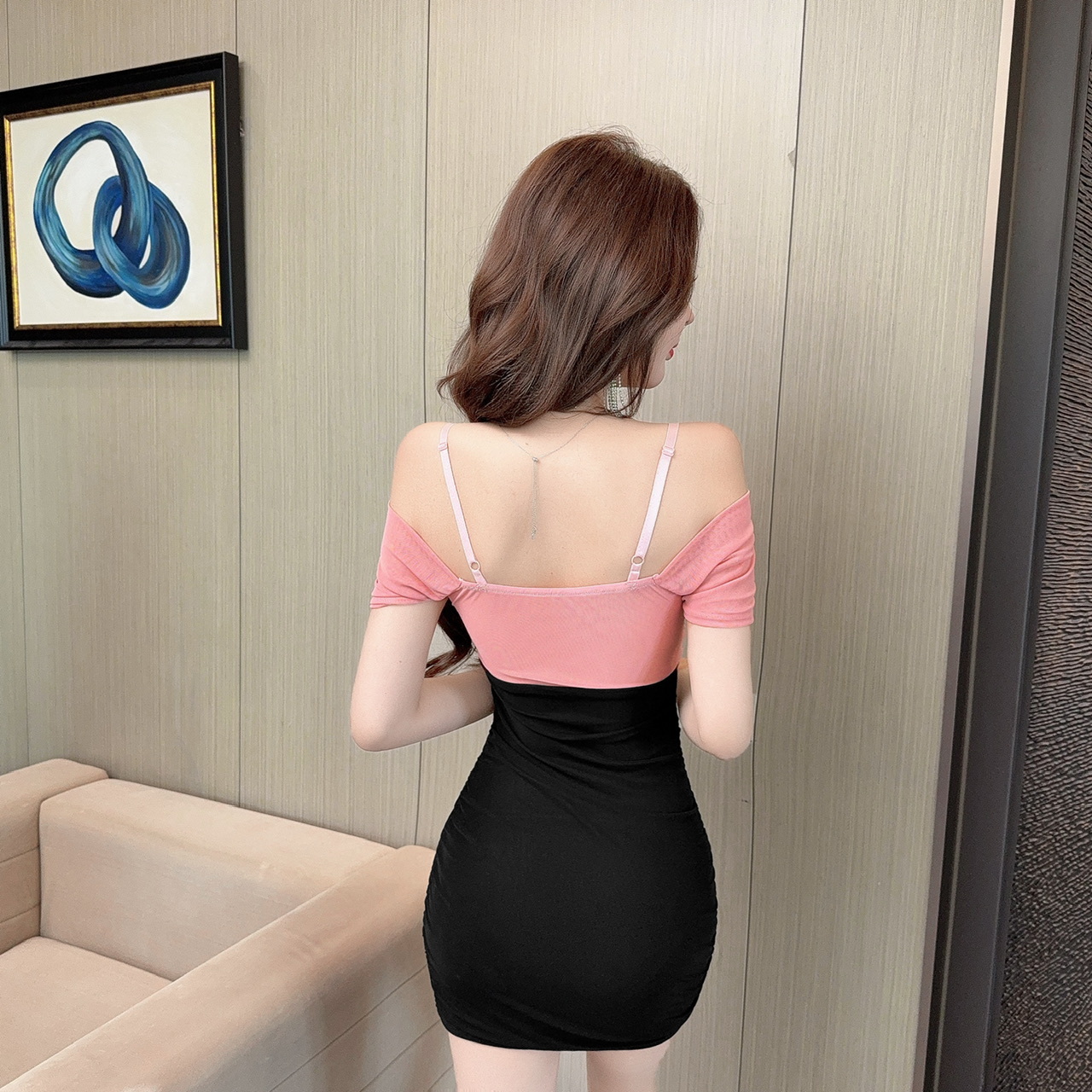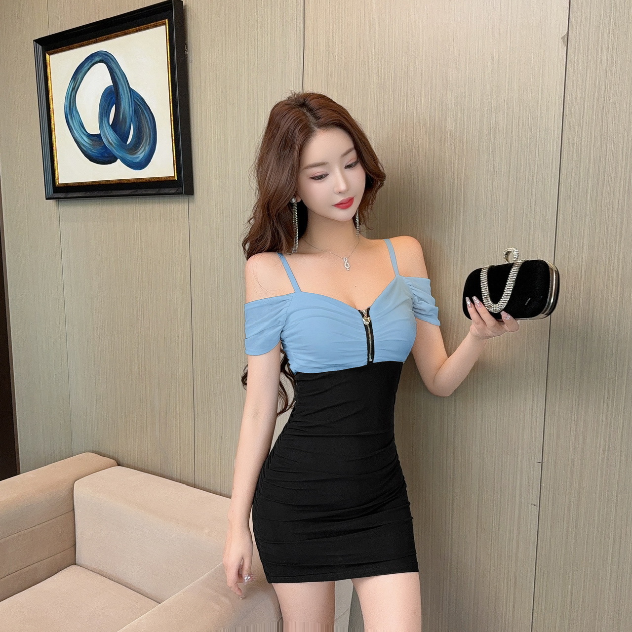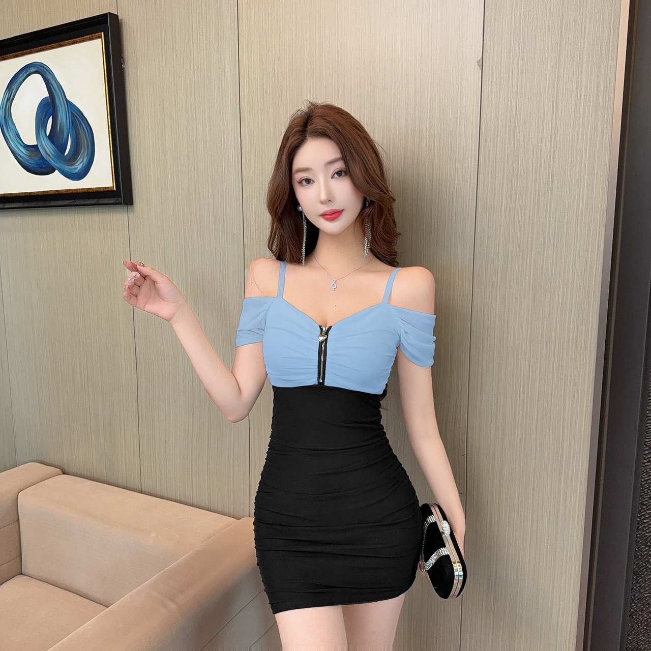 現貨-拉鏈胸抓皺連袖拼接撞色包臀短裙洋裝FY12499