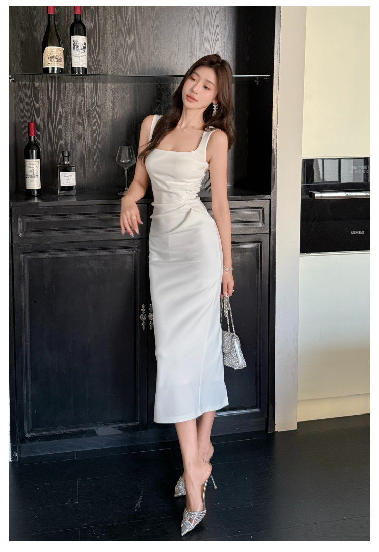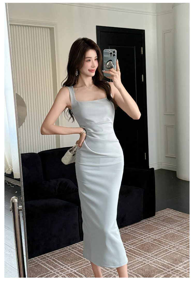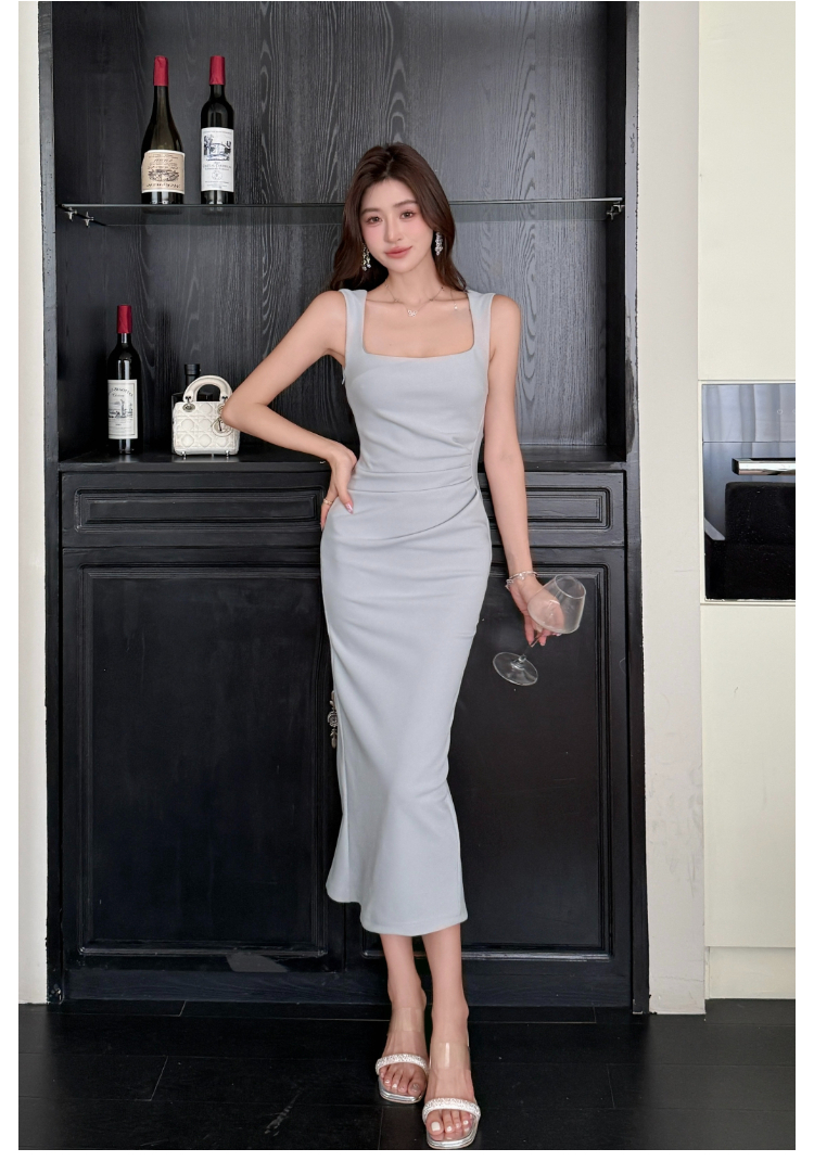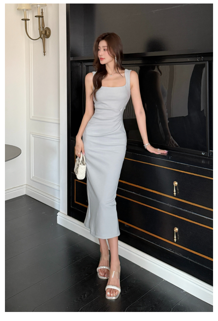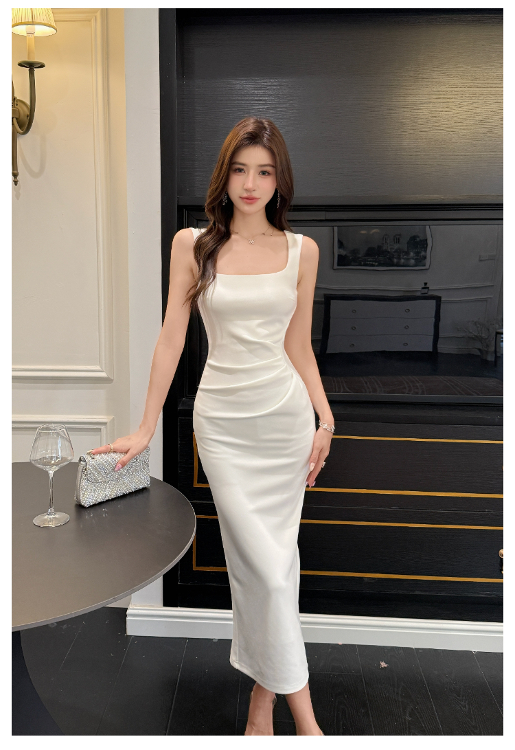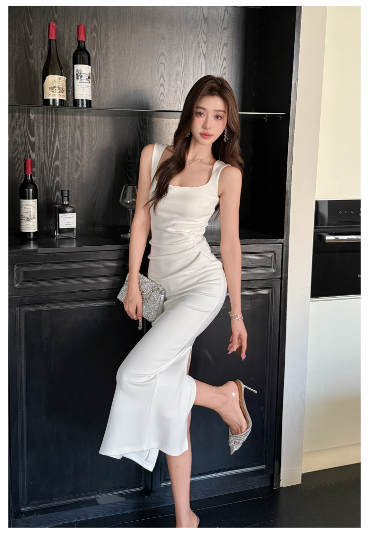 方領單邊腰抓皺後裙開岔長洋裝FZ12231