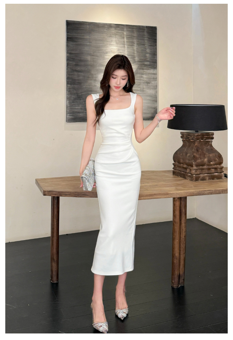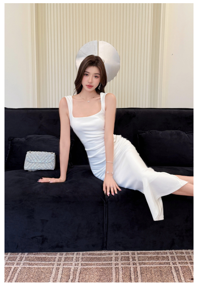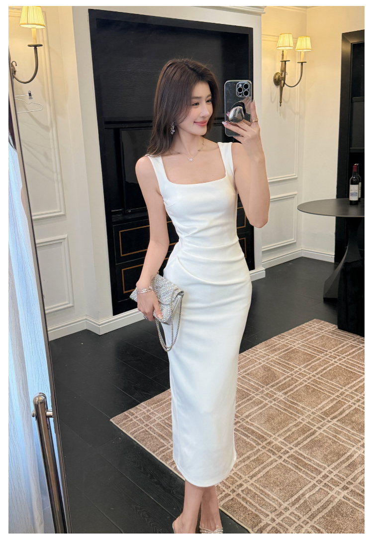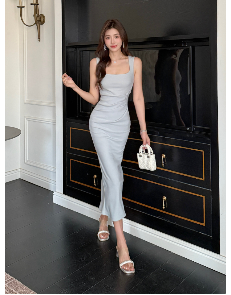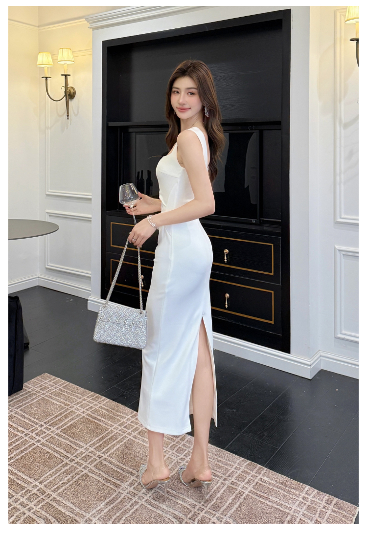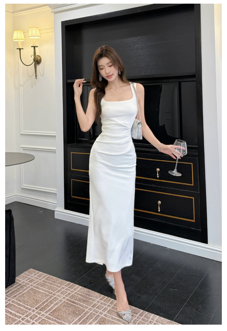 方領單邊腰抓皺後裙開岔長洋裝FZ12231