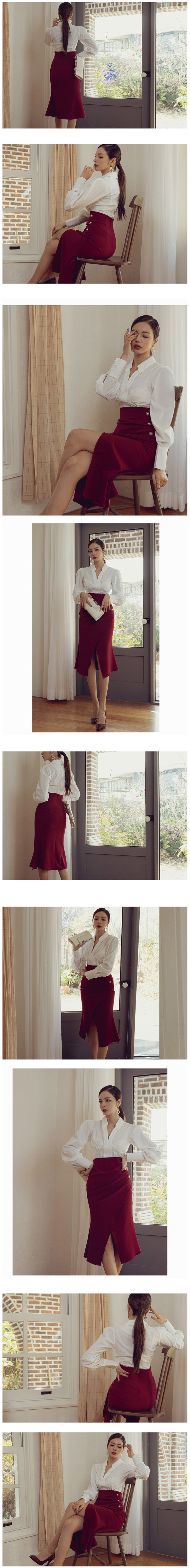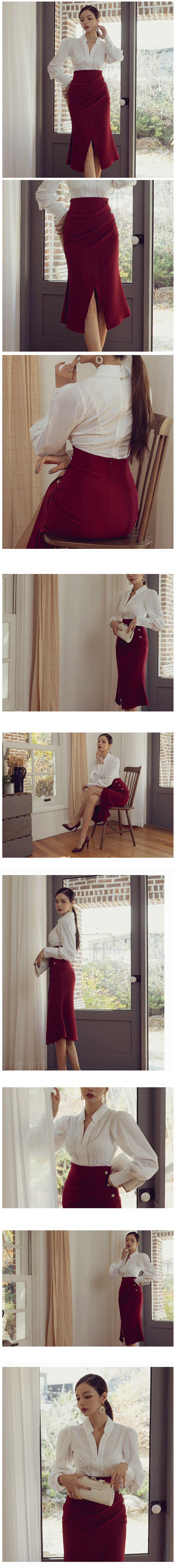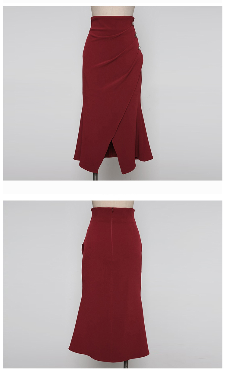 現貨-時尚OL高腰褶皺斜鈕釦開叉修身顯瘦職場通勤中長裙-麋鹿森林【SFG4002】
