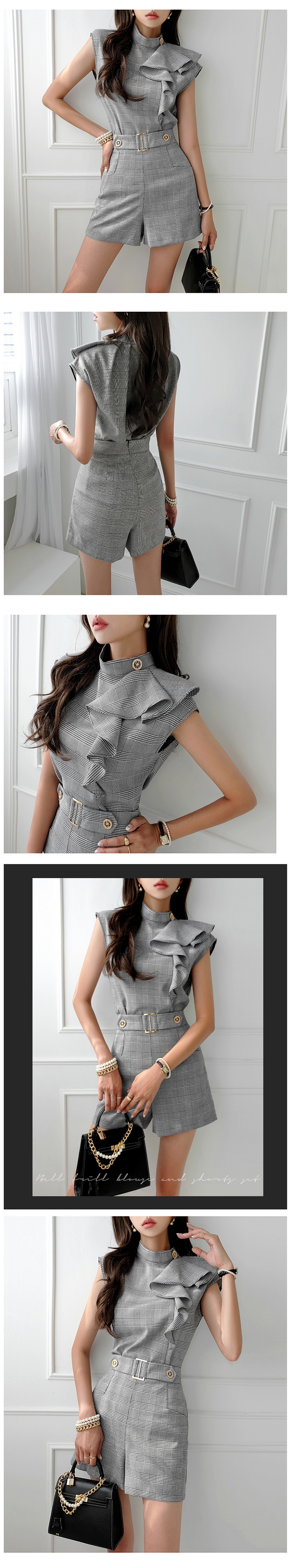 現貨-時髦千鳥格立領荷葉邊上衣+腰飾修身短褲職業套裝-麋鹿森林【SFZ8845】