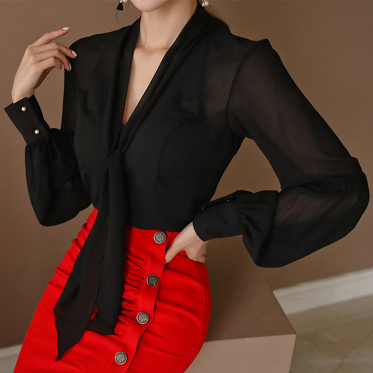現貨-氣質優雅繫帶雪紡燈籠透紗袖職場通勤上衣-麋鹿森林【SFG9387】