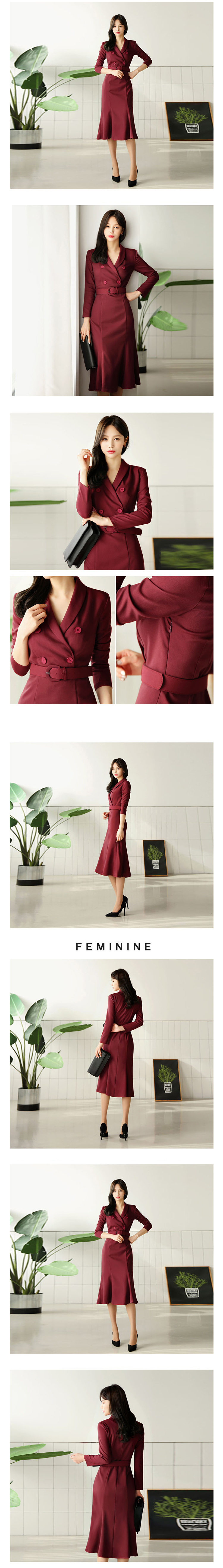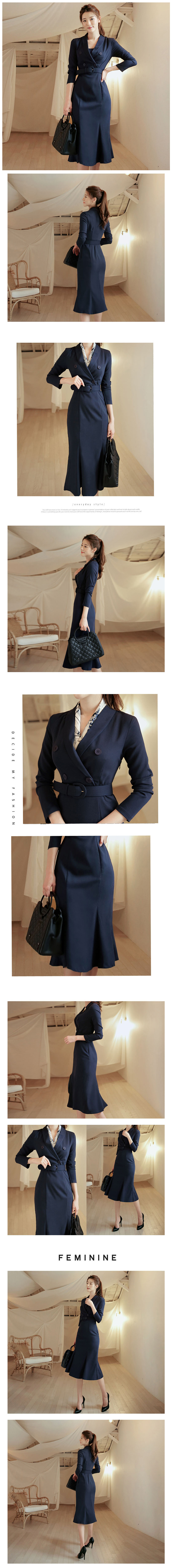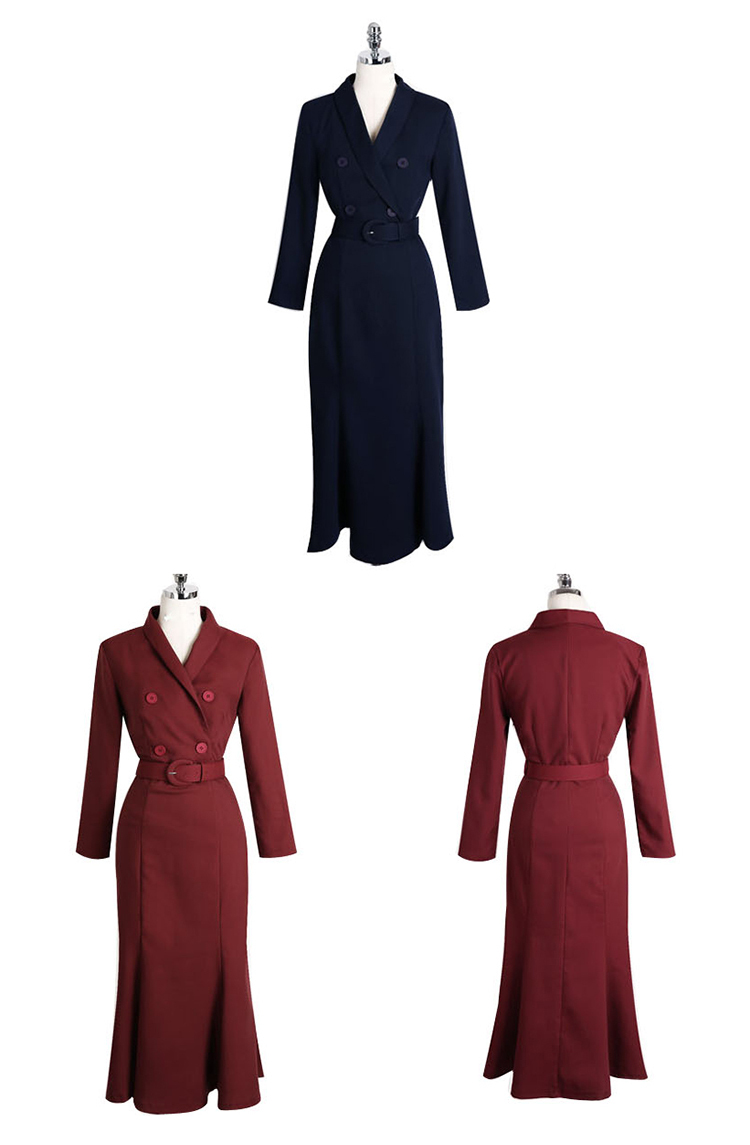 現貨-氣質優雅西裝領雙排釦腰帶修身顯瘦魚尾職業連身中長裙通勤洋裝-麋鹿森林【SFG3799】