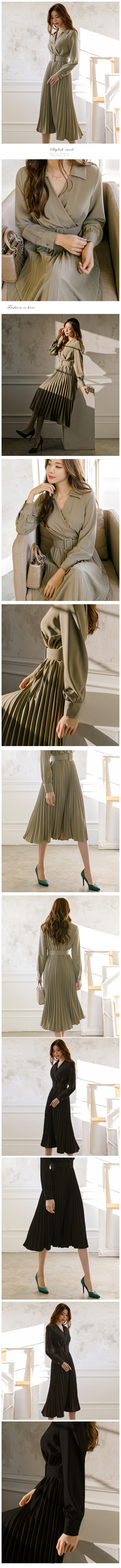 現貨-法式氣質翻領交叉V領腰帶修身顯瘦百褶連身中長裙職場通勤洋裝-麋鹿森林【SFG7845】