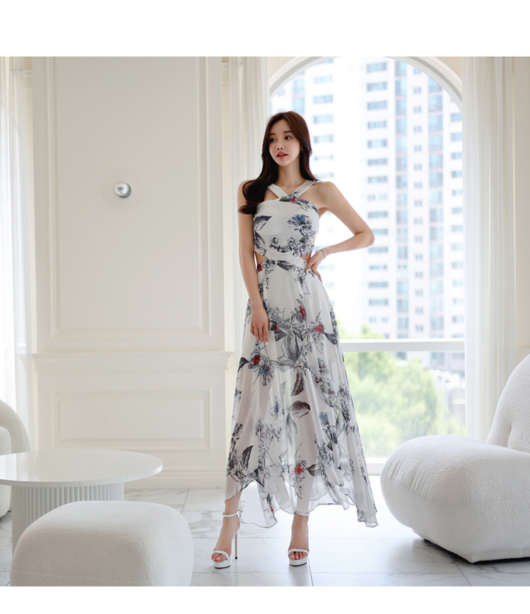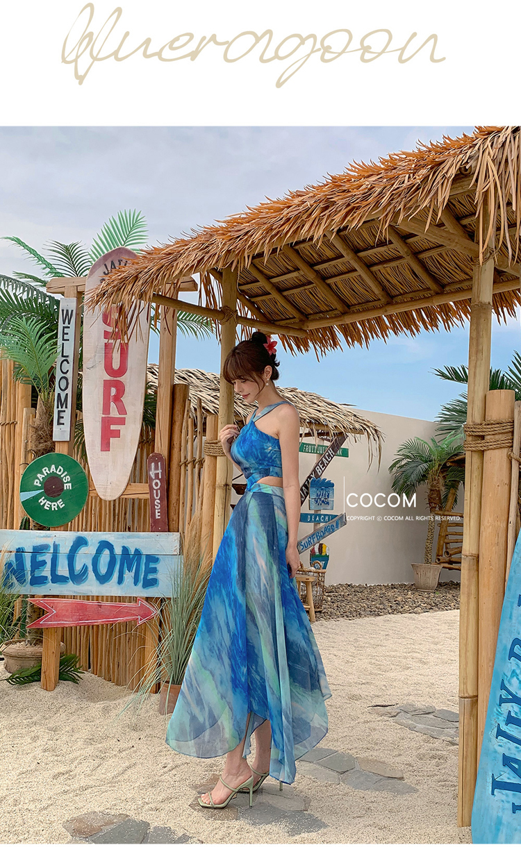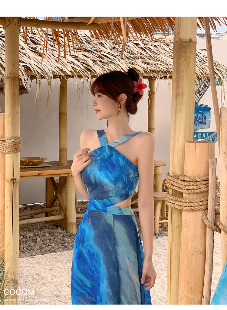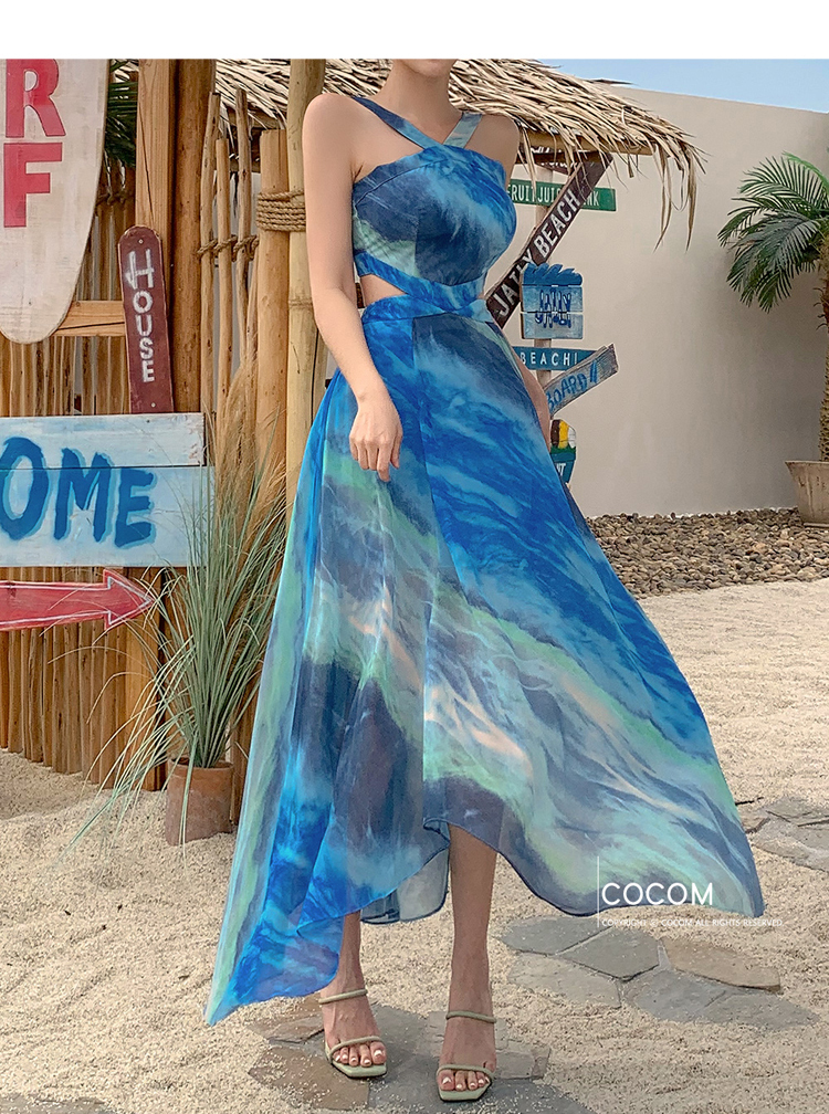 現貨-渡假風腰鏤空繞頸露肩長裙洋裝FK12396
