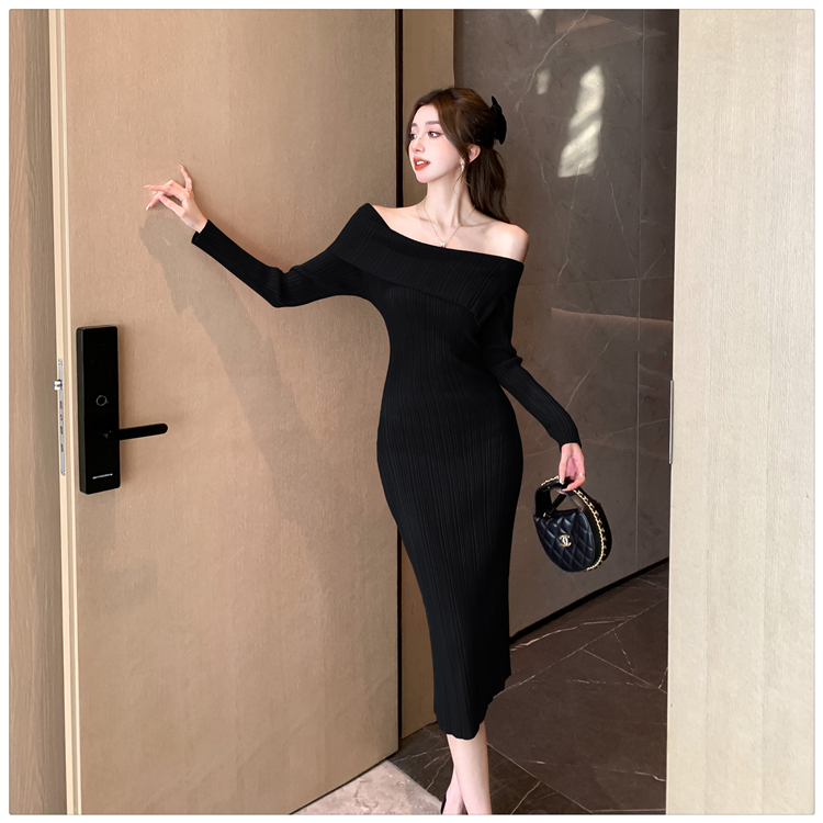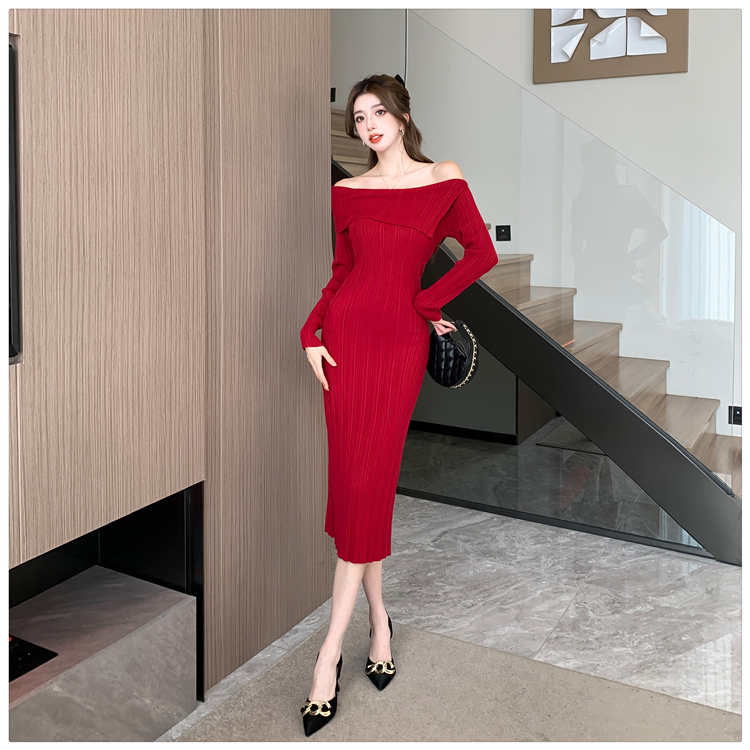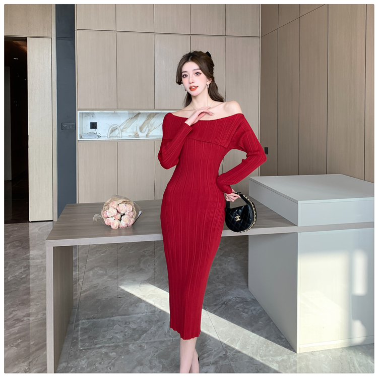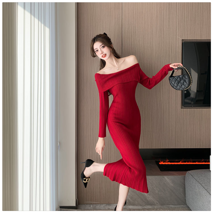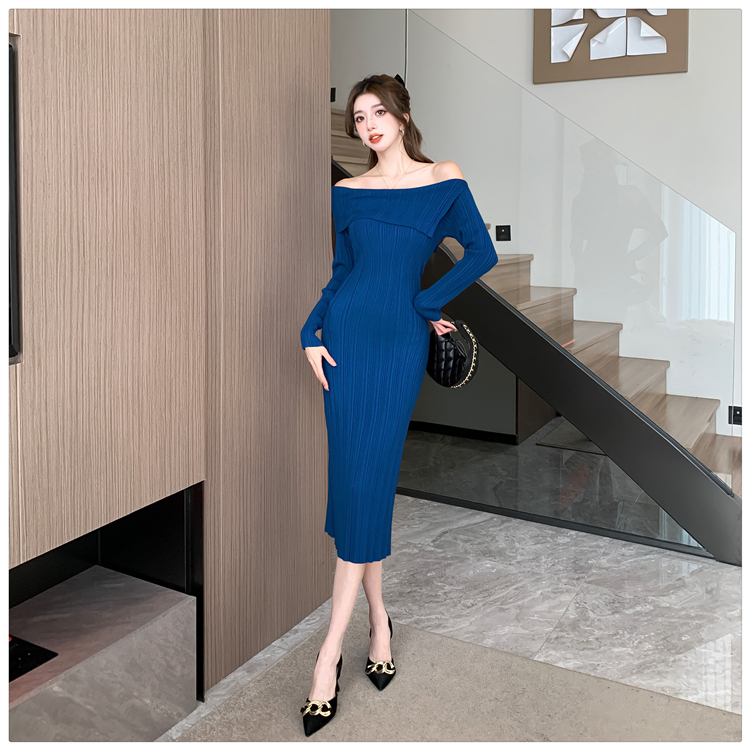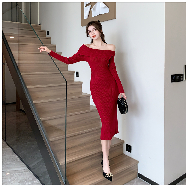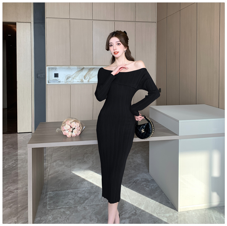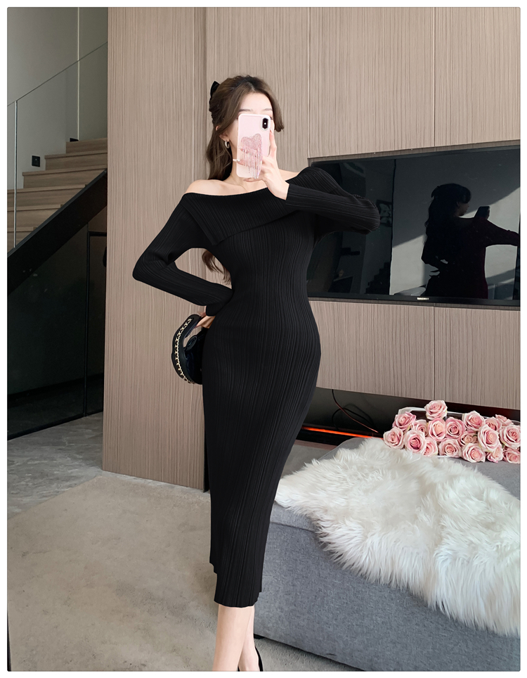 粗細坑條針織翻領露肩長裙洋裝FZ13084
