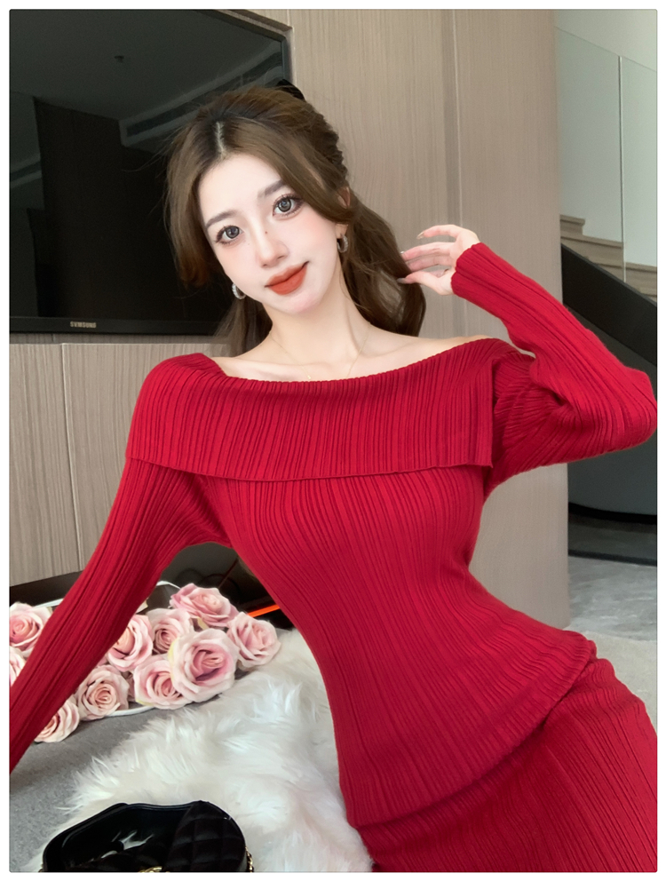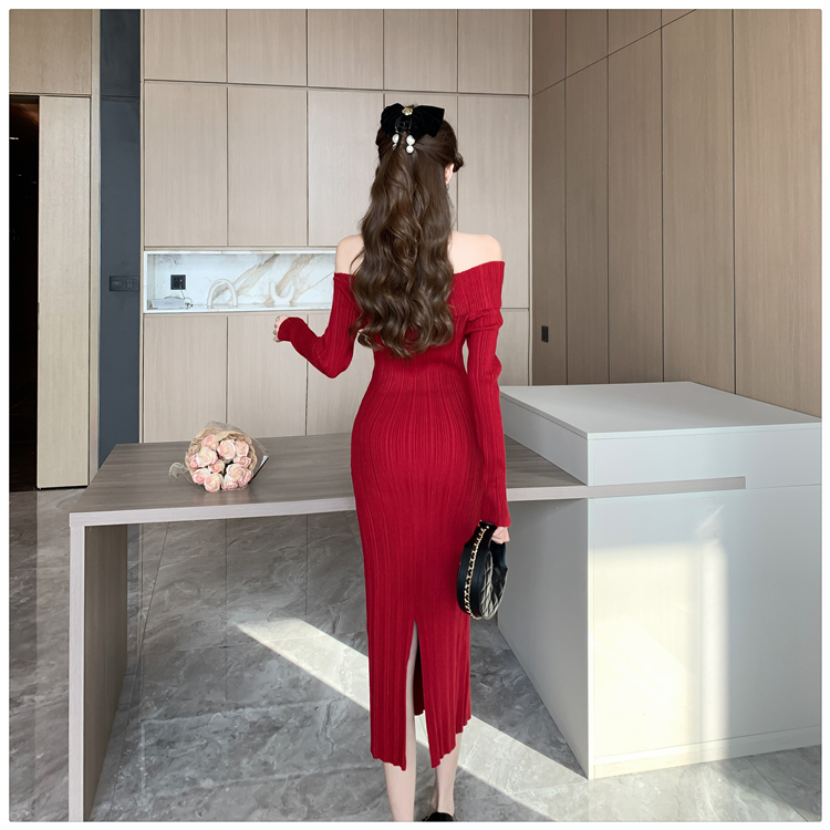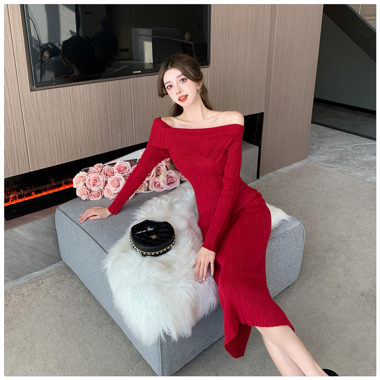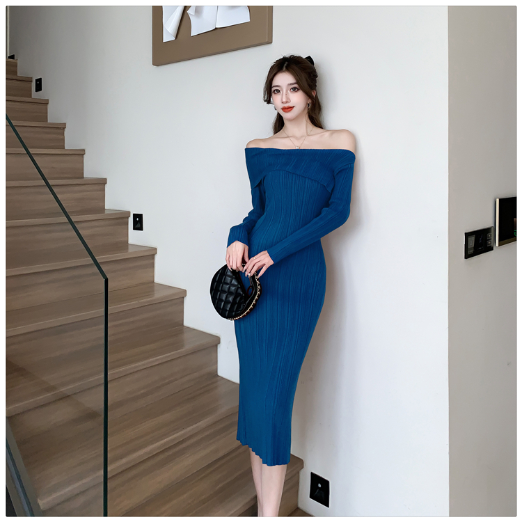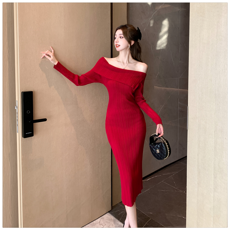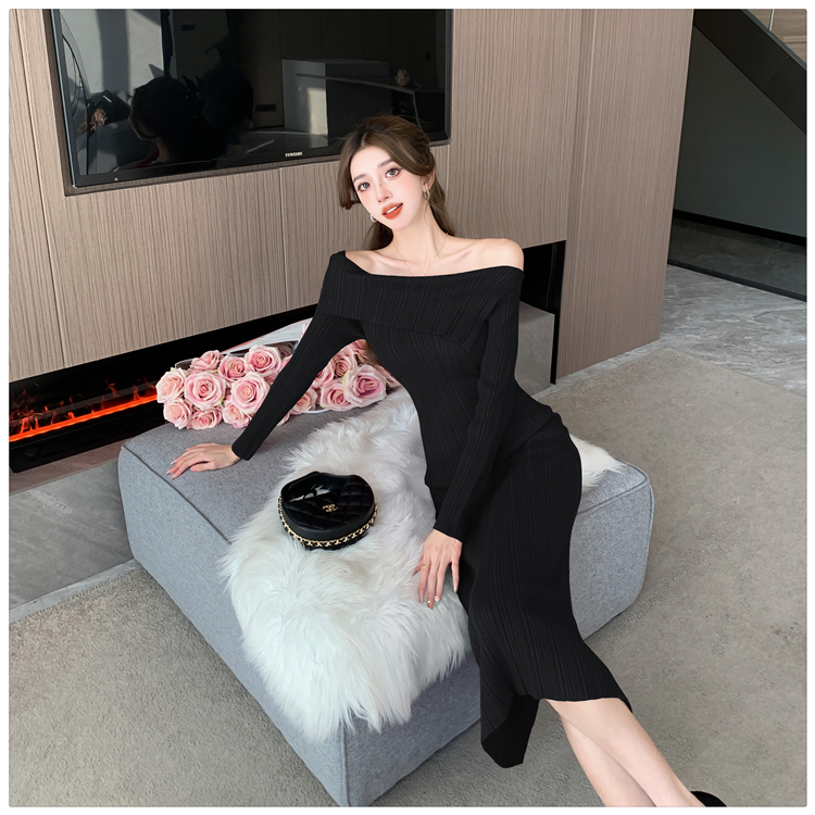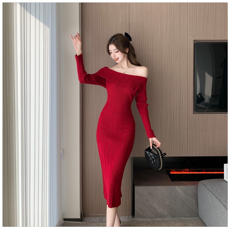 粗細坑條針織翻領露肩長裙洋裝FZ13084