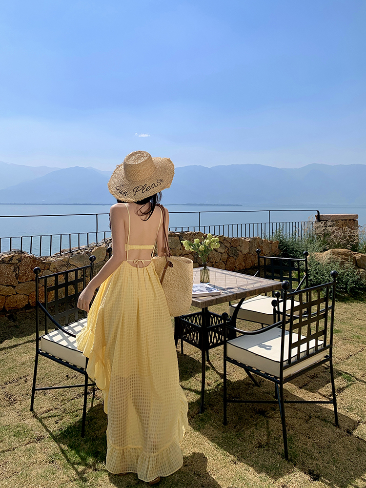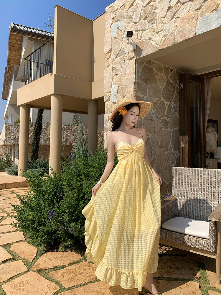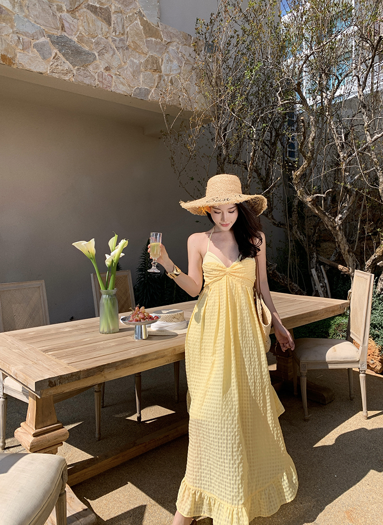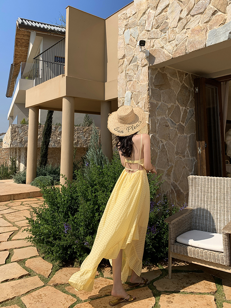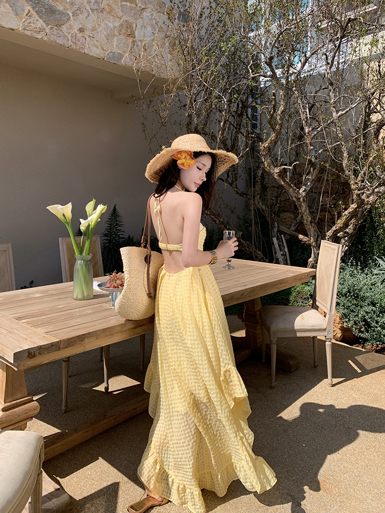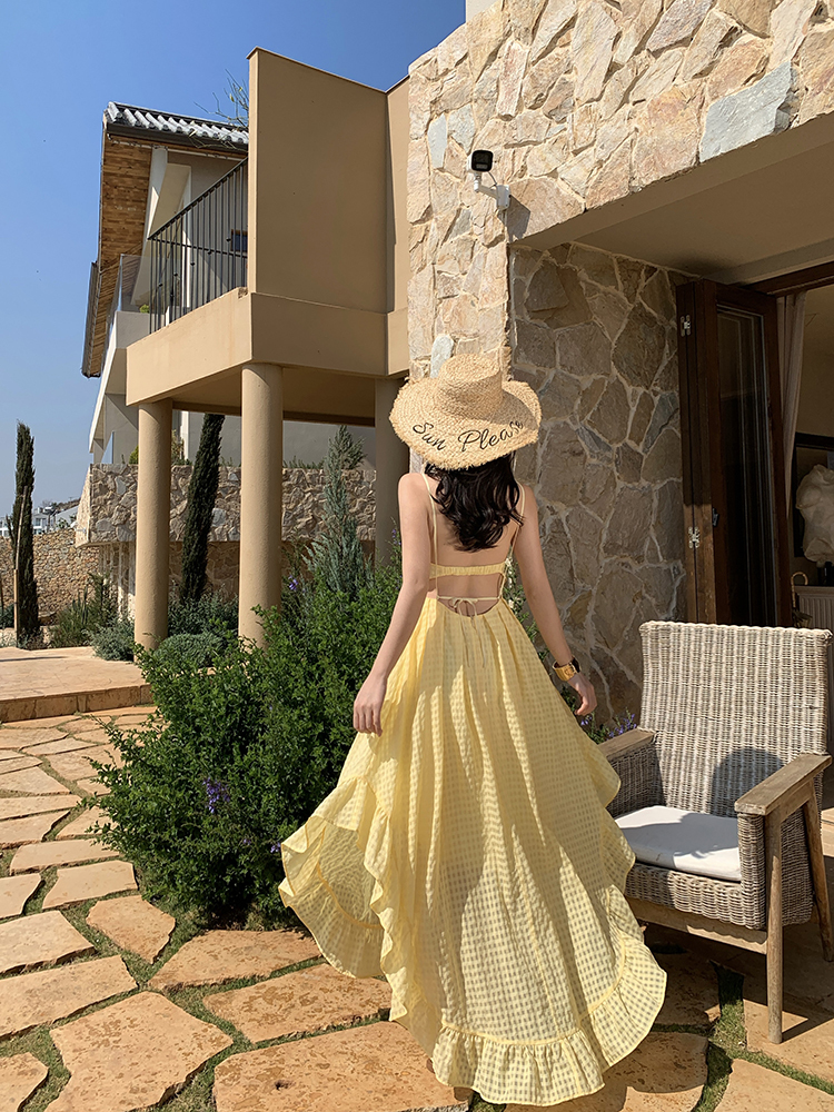 黃色格紋露背圓弧大裙襬洋裝渡假FZ12608