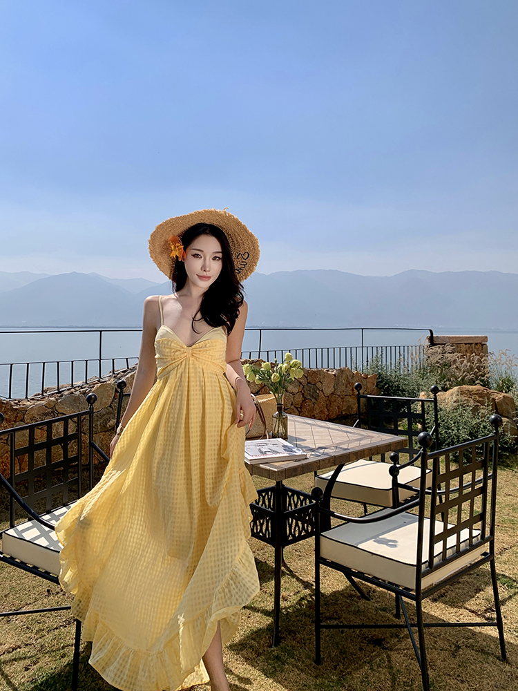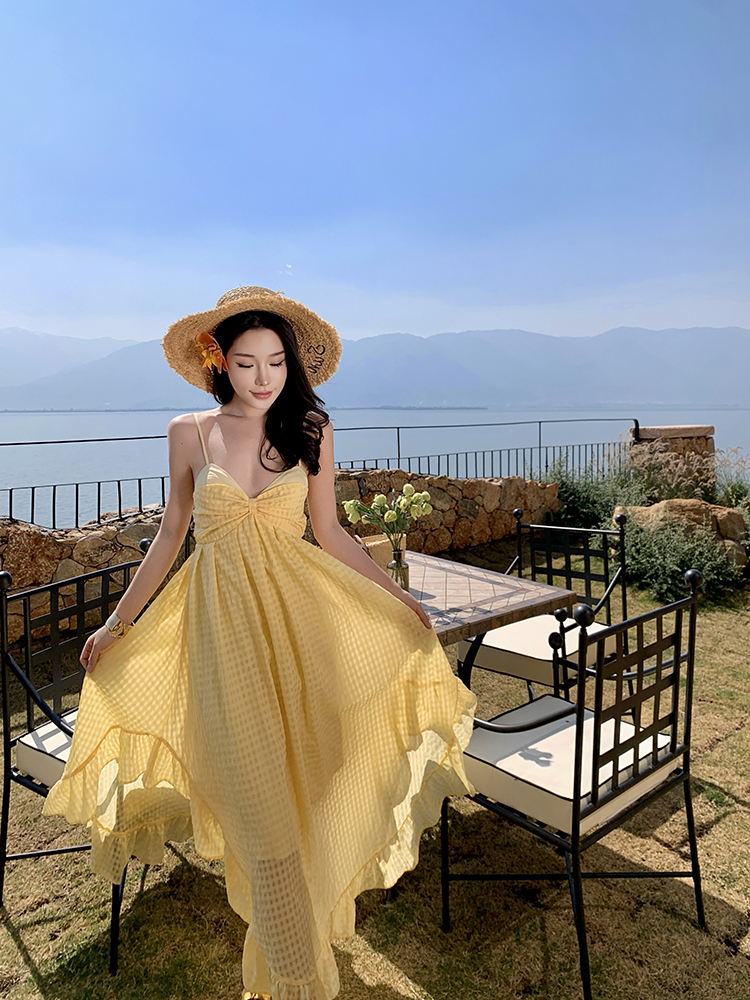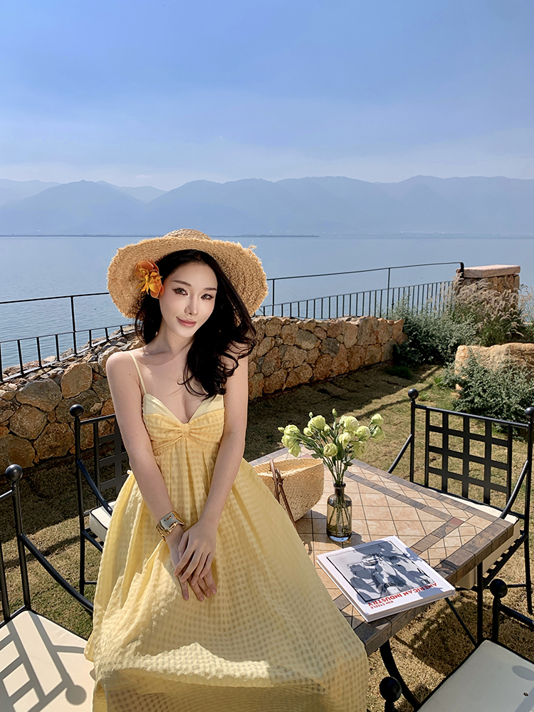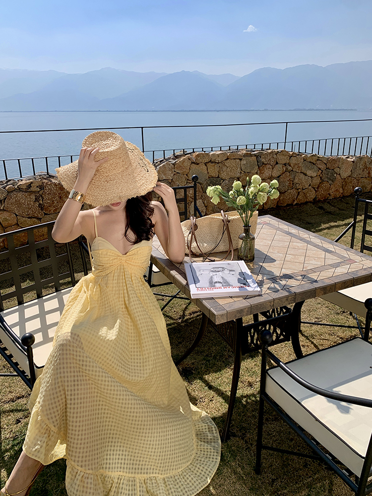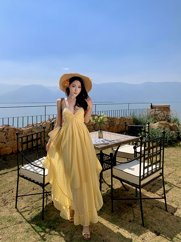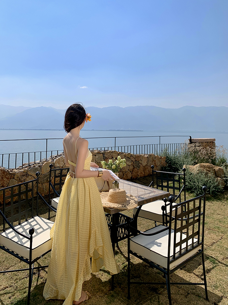 黃色格紋露背圓弧大裙襬洋裝渡假FZ12608