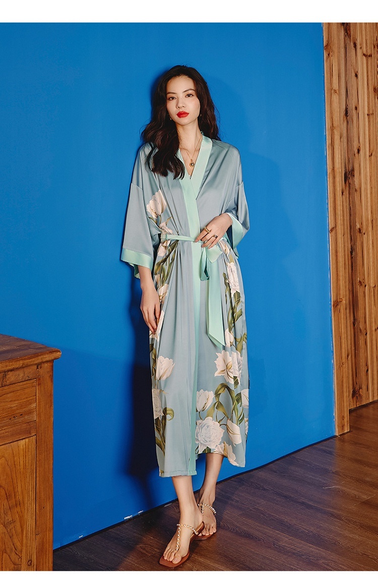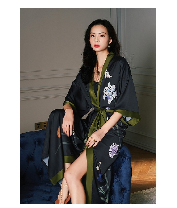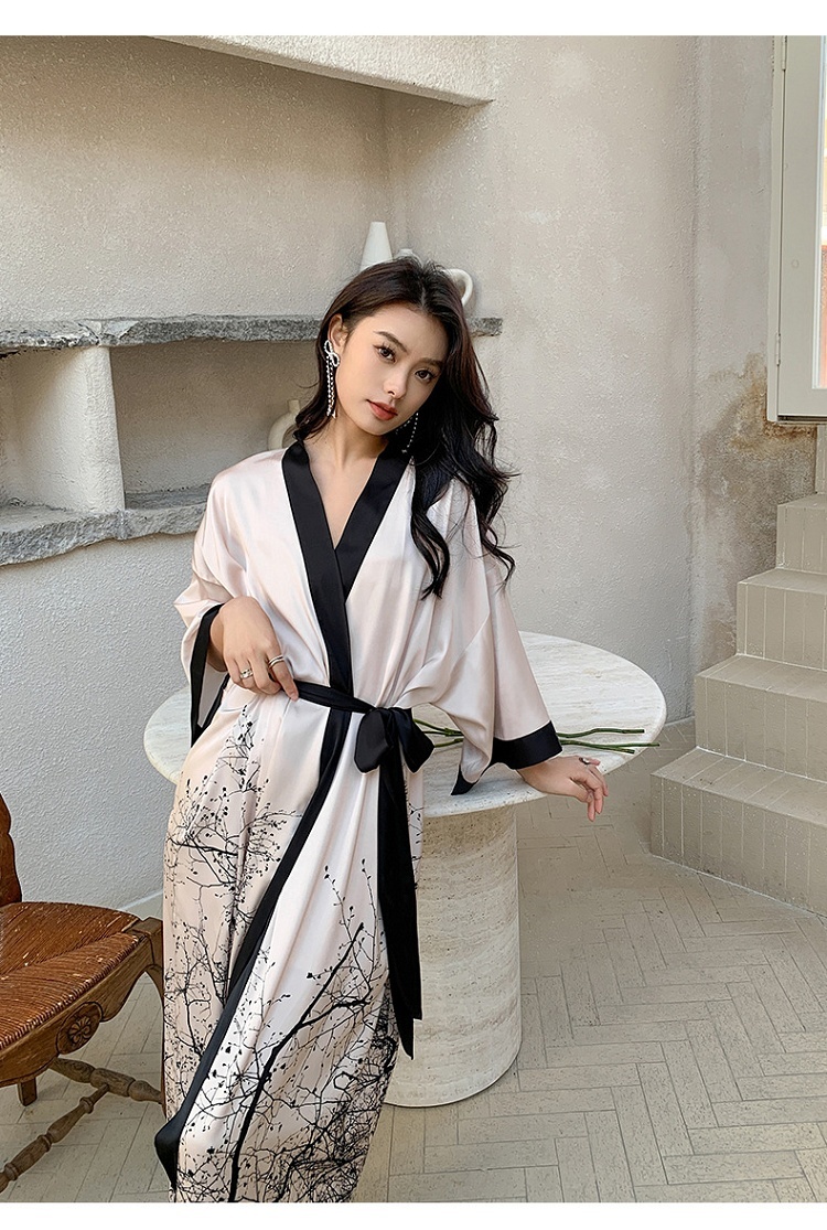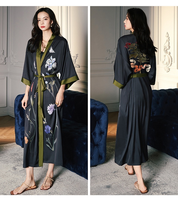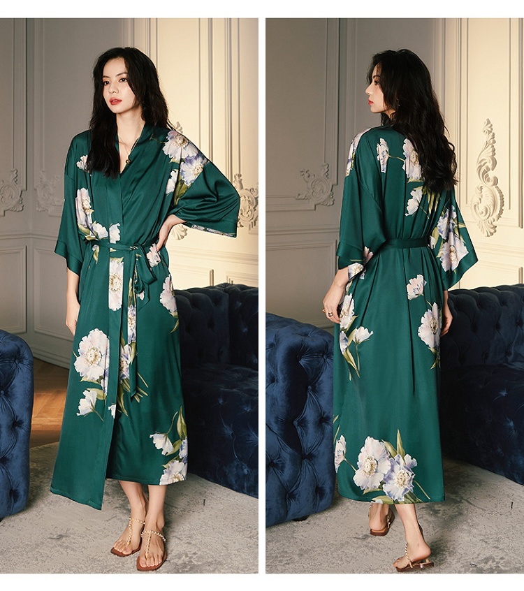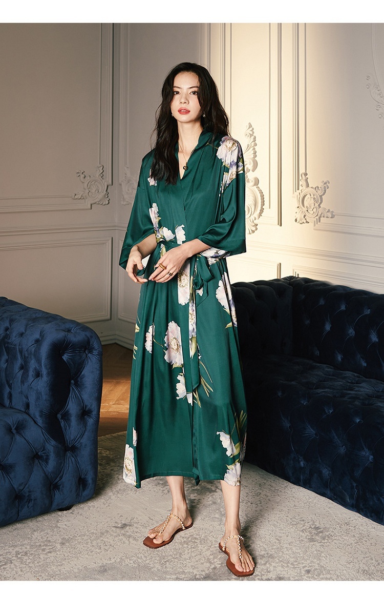 綢緞印花絲滑七分袖綁帶長版睡袍-麋鹿森林SGZ8971A