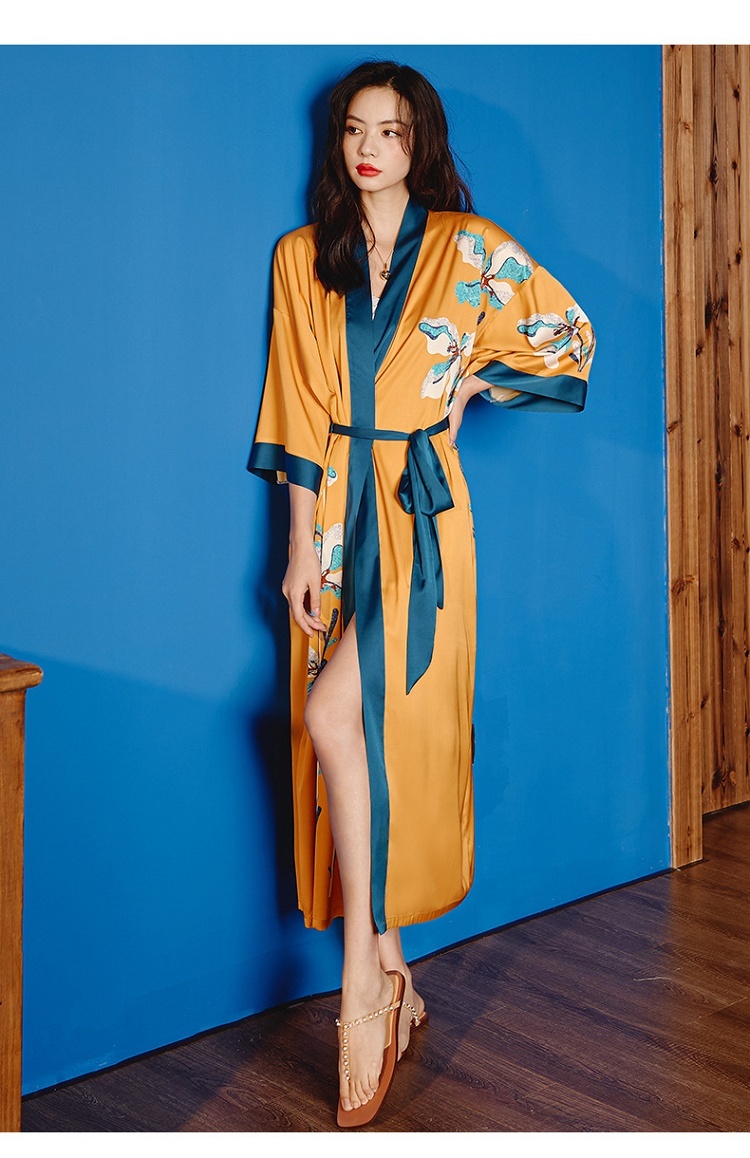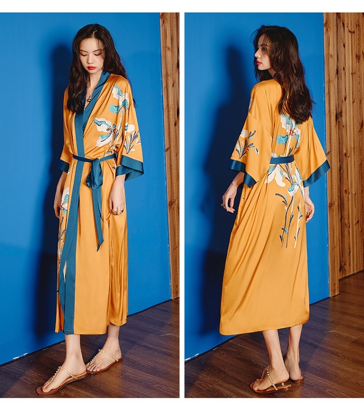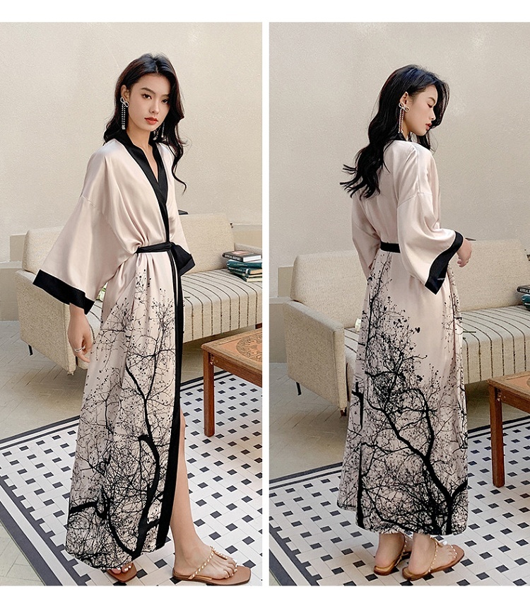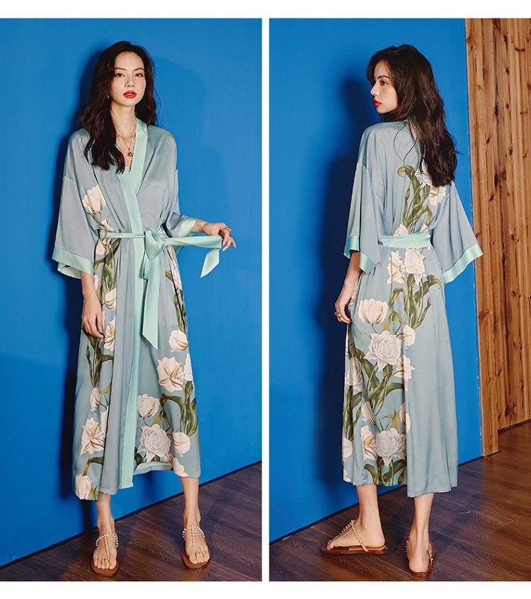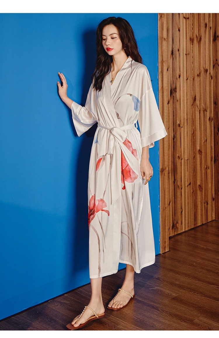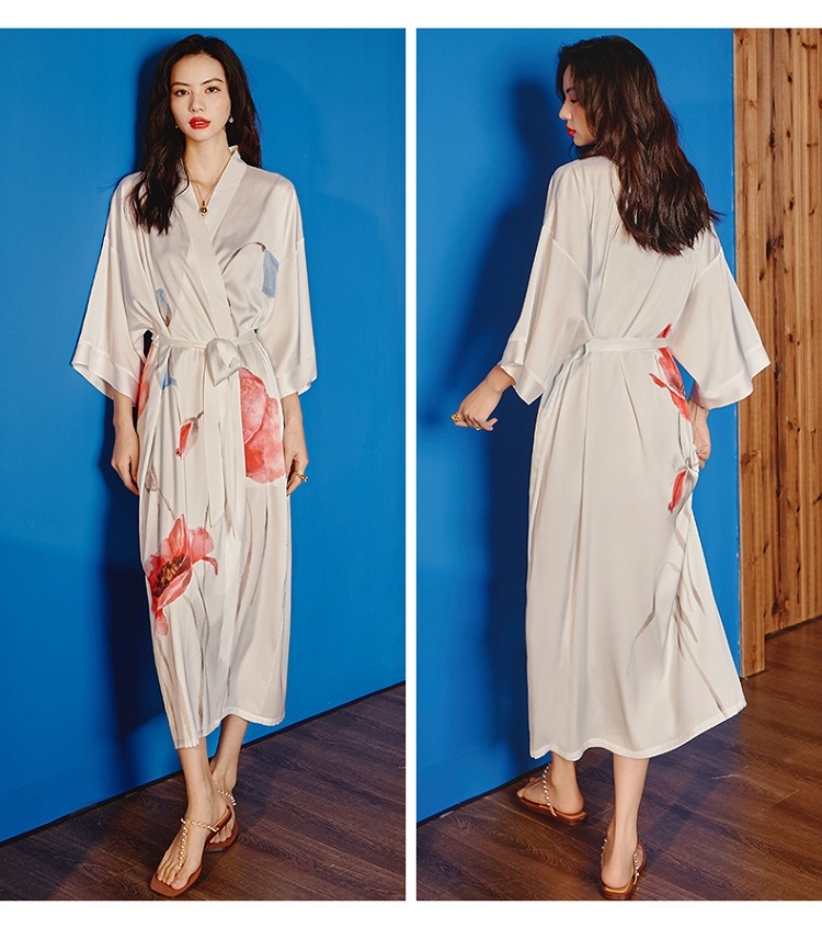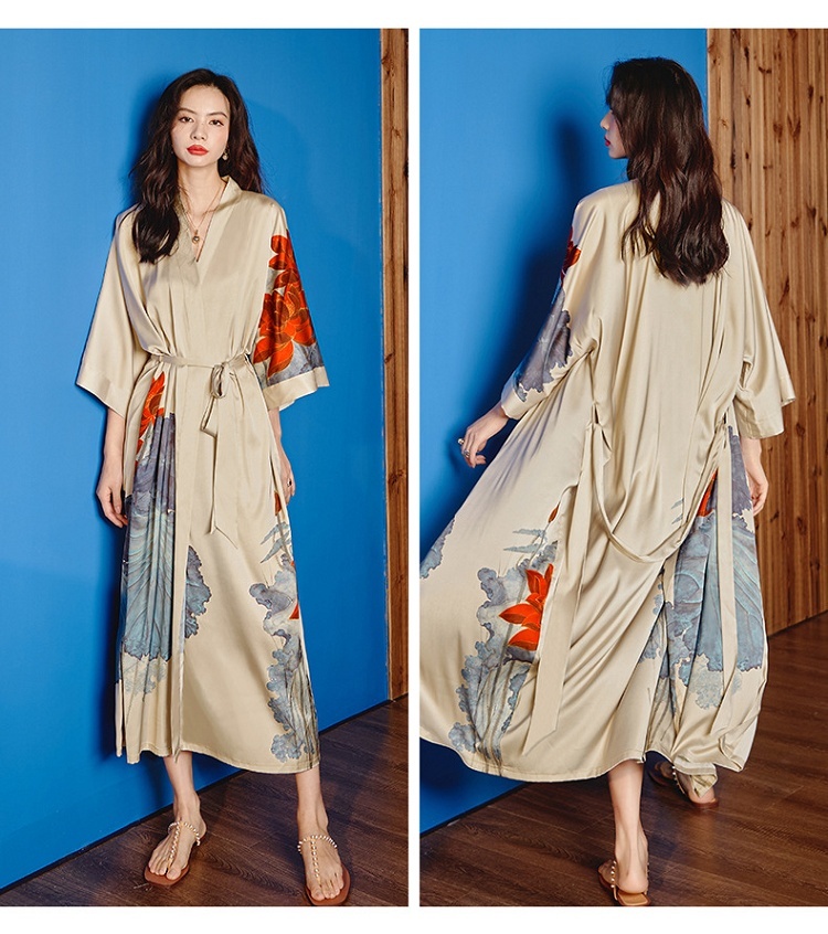 綢緞印花絲滑七分袖綁帶長版睡袍-麋鹿森林SGZ8971A