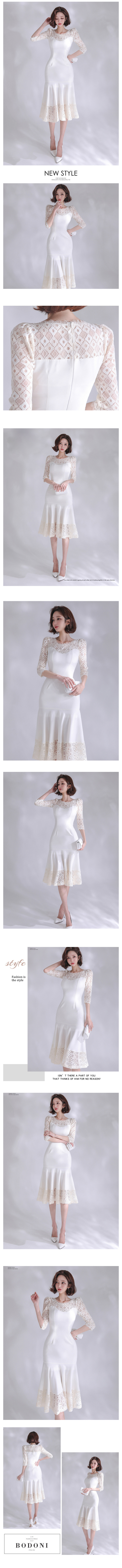 現貨-小香優雅蕾絲袖花邊領拼接抹胸修身魚尾中長裙宴會洋裝-麋鹿森林【SFK7813】