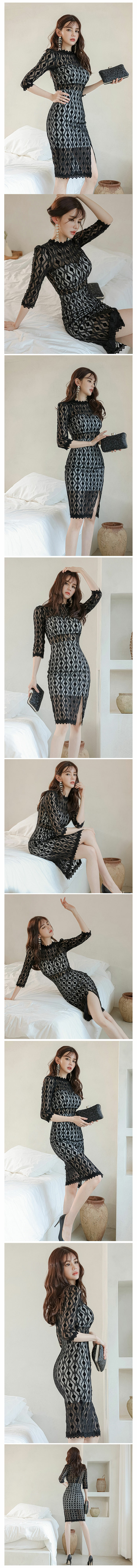 現貨-名媛性感優雅菱格透視蕾絲收腰修身開叉連身中長裙禮服洋裝-麋鹿森林【SEL6359】