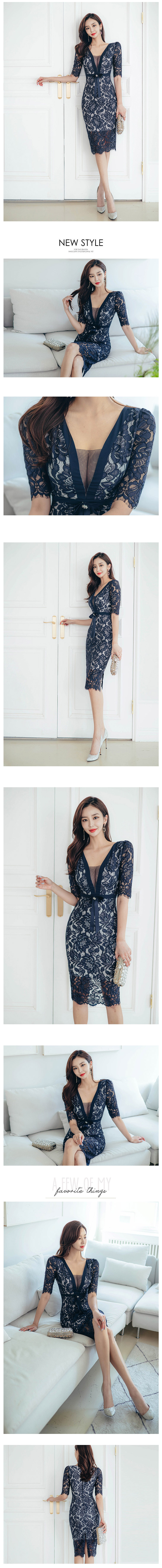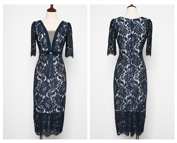 現貨-性感蕾絲拼接透視網紗縮腰修身珍珠鑽蝴蝶結緞帶別針中長裙禮服洋裝-麋鹿森林【SFK9132】