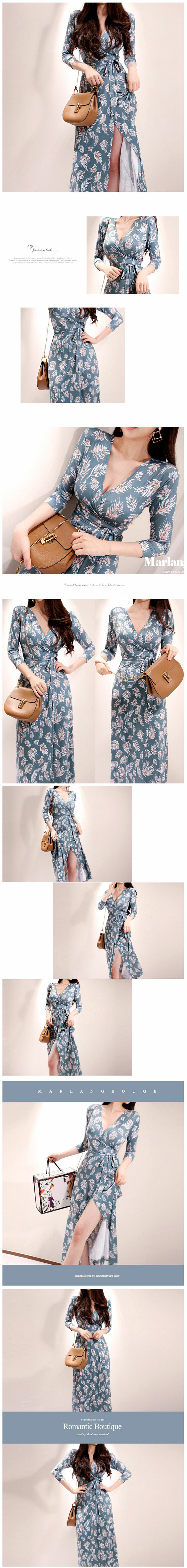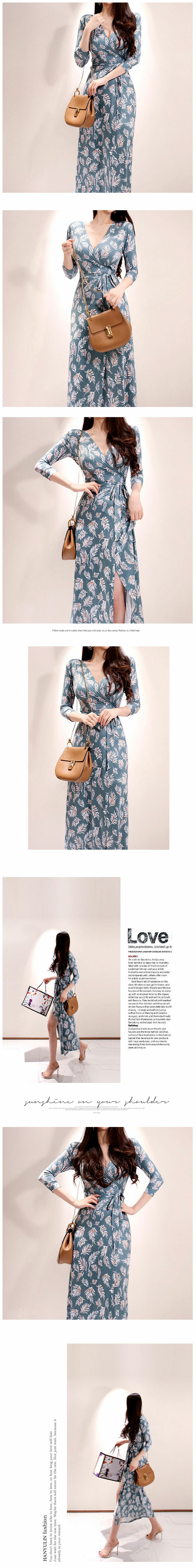 現貨-性感V領開襟繫帶收腰修身開叉印花連身中長裙度假洋裝-麋鹿森林【SFE8465】