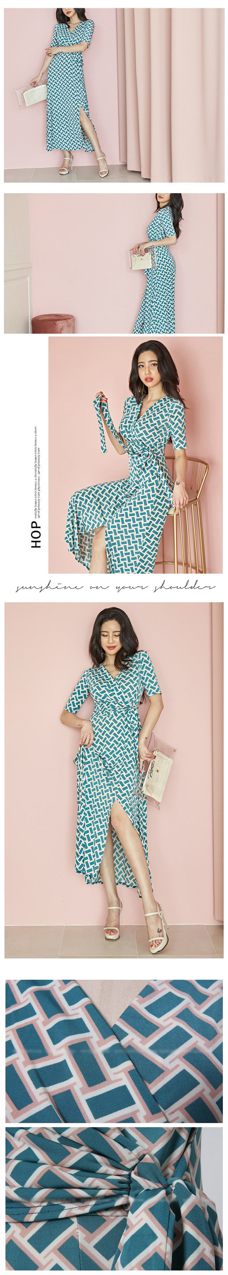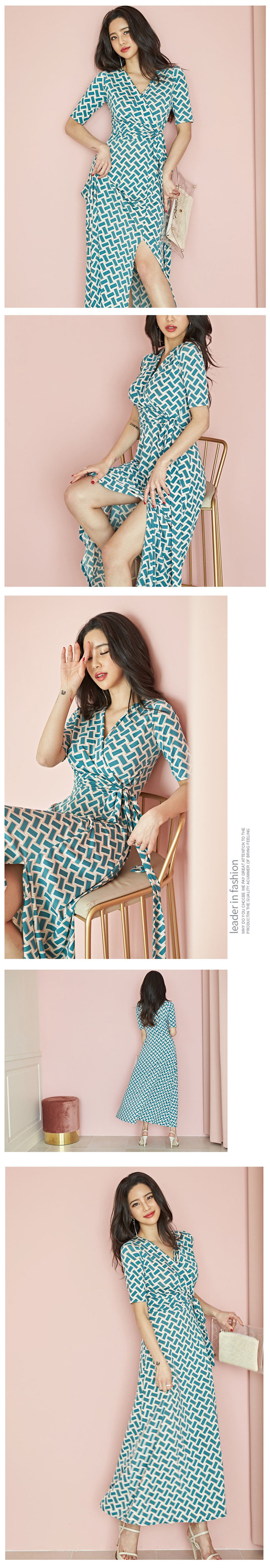現貨-時尚幾何印花交叉V領綁帶收腰修身開叉連身中長裙洋裝-麋鹿森林【SEL4456】