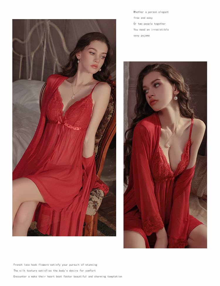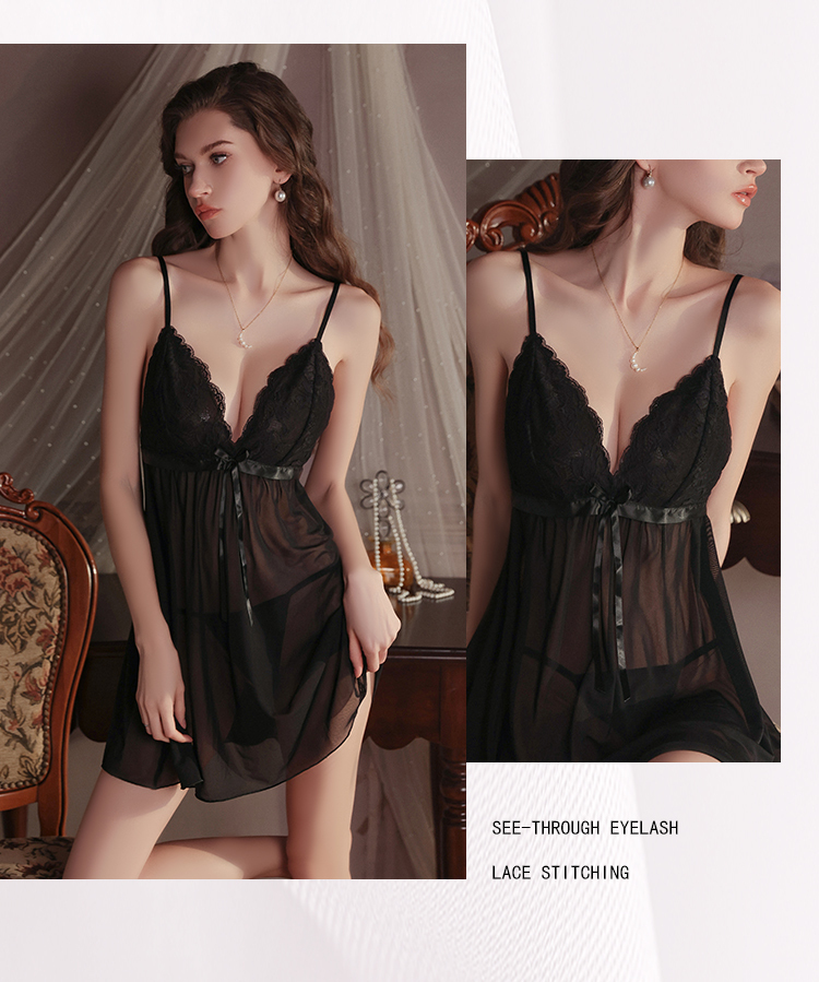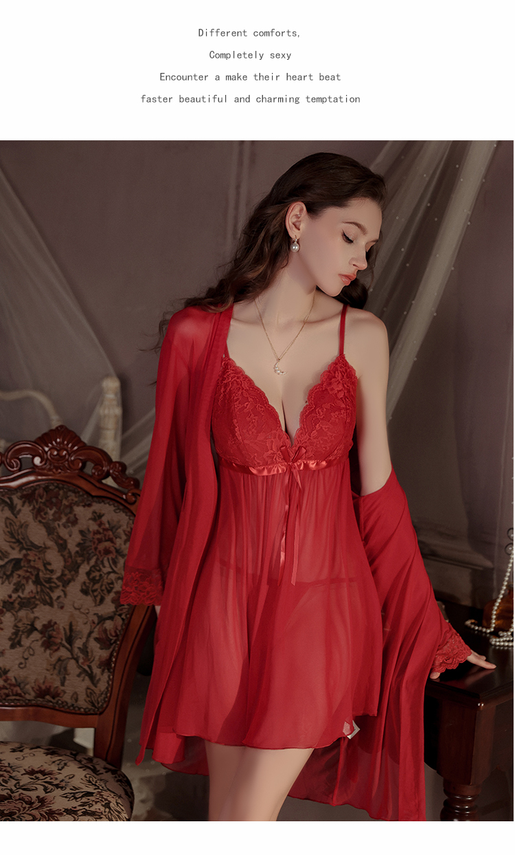 蕾絲胸拼接網紗睡裙附丁字褲&外袍