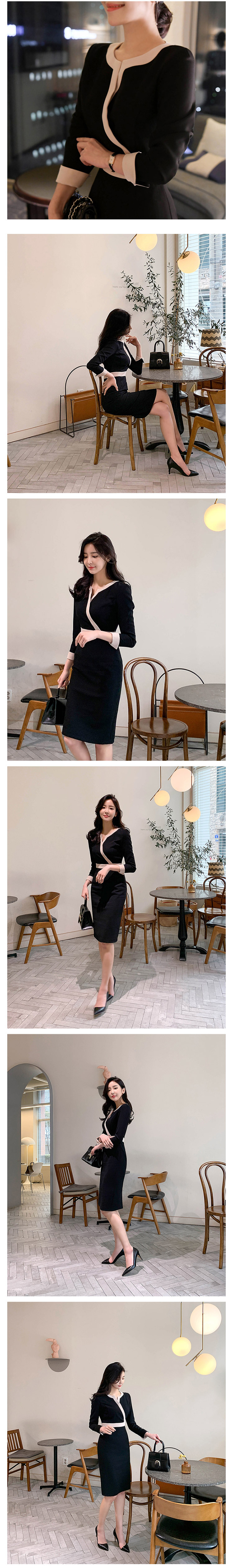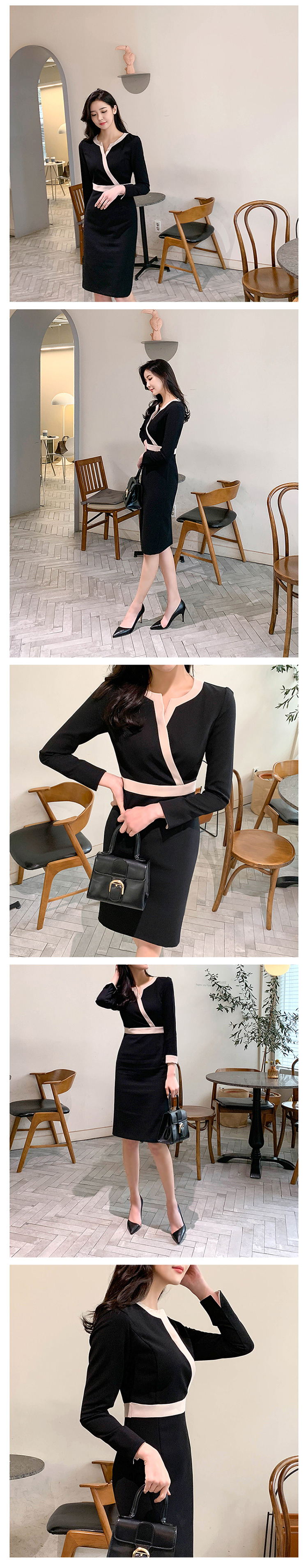 現貨-赫本風優雅滾邊配色交叉V領收腰修身職業連身中長裙通勤洋裝-麋鹿森林【SFG6414】